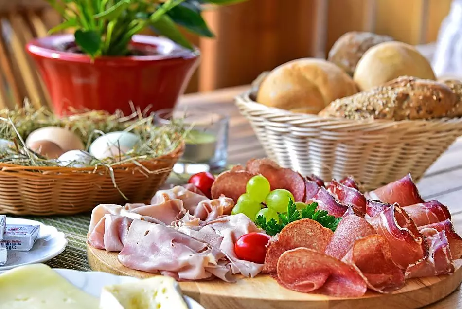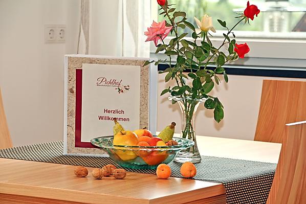 - Hofeigene Produkte beim Frühstück: Eier, Fruchtaufstriche, Sirup, Fruchtsäfte, Trockenobst, Kräutertee, Backwaren, Frisches Obst je nach Saison