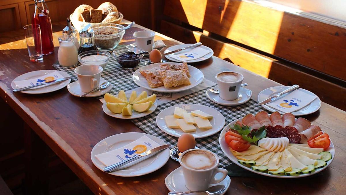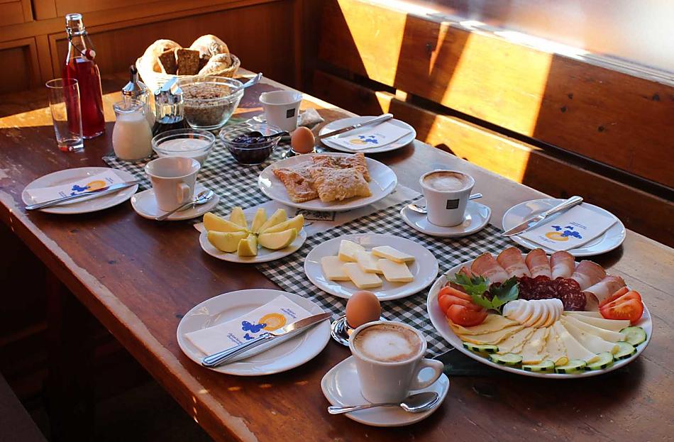 - Frühstück im Aufenthaltsraum, Frühstück in der Bauernstube, Frühstück im Freien (je nach Saison), Gabelfrühstück, Frühstückskorb