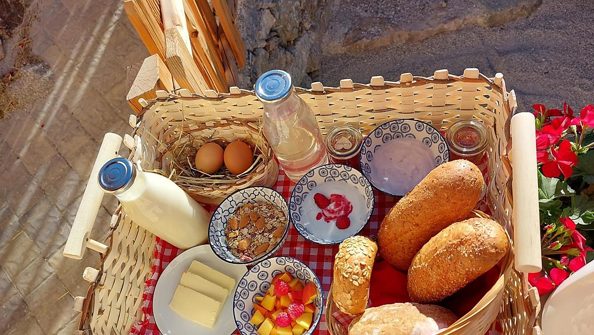 - Hofeigene Produkte beim Frühstück: Milch, Eier, Fruchtaufstriche, Sirup, Kräutertee, Kräutergewürze, Frisches Obst je nach Saison