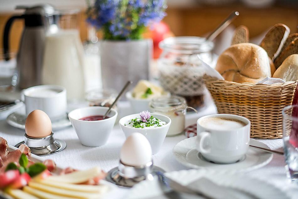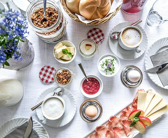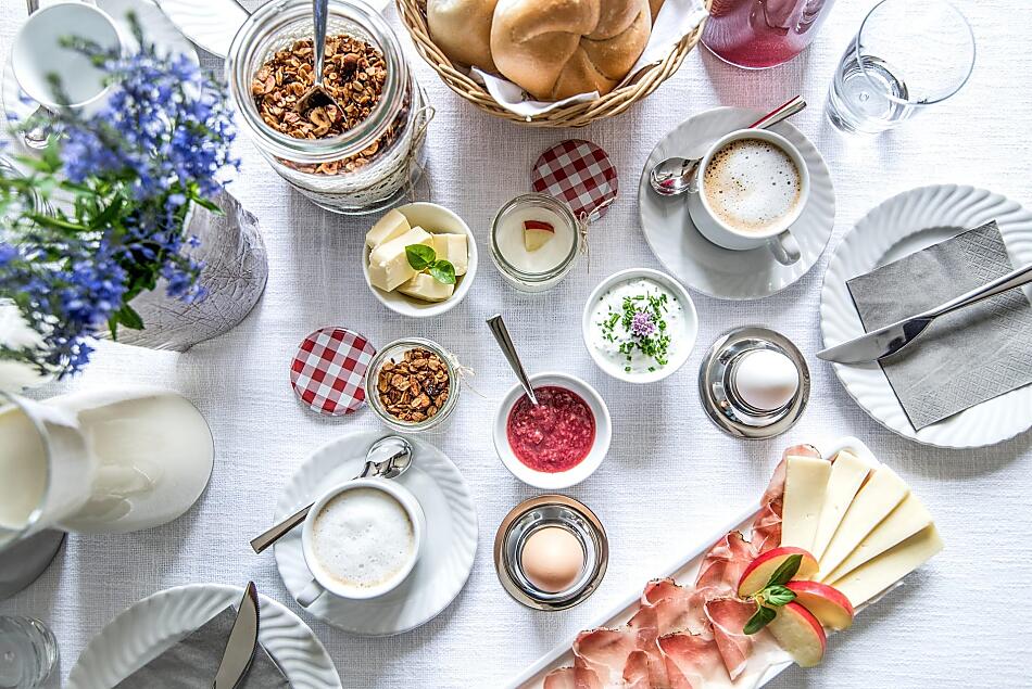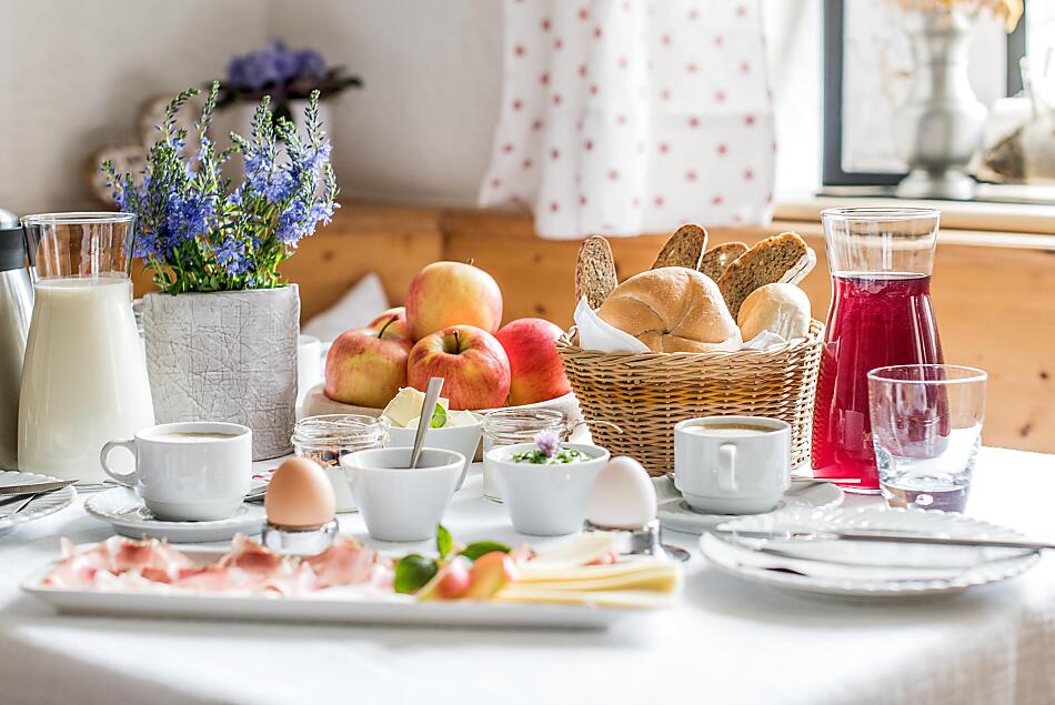 - Hofeigene Produkte beim Frühstück: Milch, Eier, Fruchtaufstriche, Sirup, Frisches Obst je nach Saison
