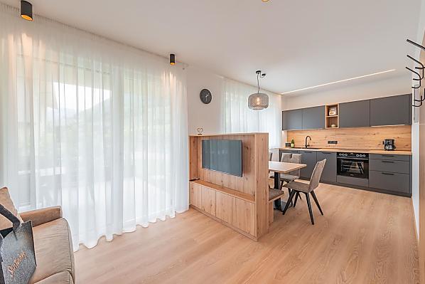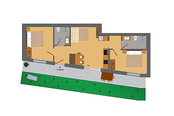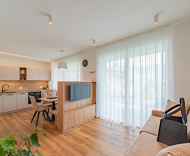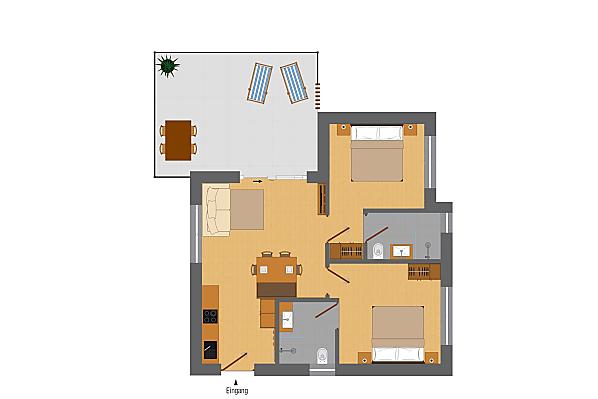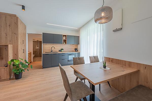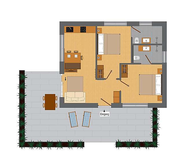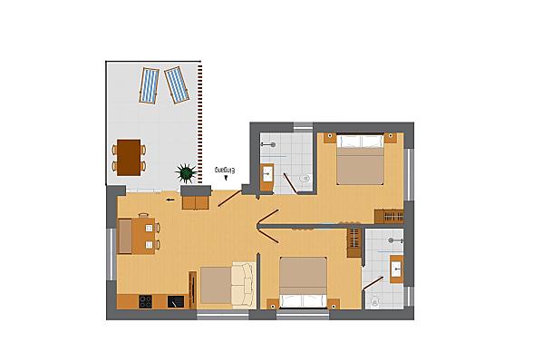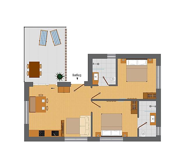 Es erwarten Sie 5 moderne, gemütliche und voll ausgestattete Ferienwohnungen mit Terrasse sowie jeweils 2 Schlafzimmern und 2 Bädern.