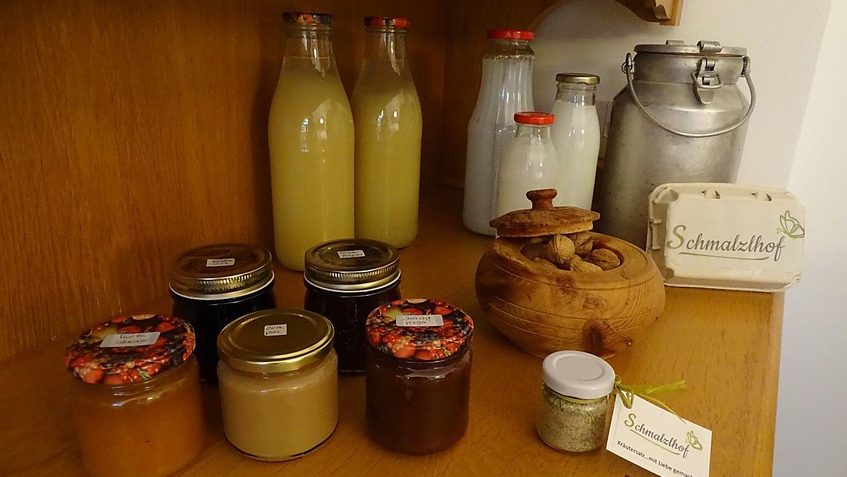 - Hofeigene Produkte beim Frühstück: Milch, Joghurt, Eier, Fruchtaufstriche, Sirup, Fruchtsäfte, Gelees, Kräutertee, Kräutergewürze, Frisches Obst je nach Saison
