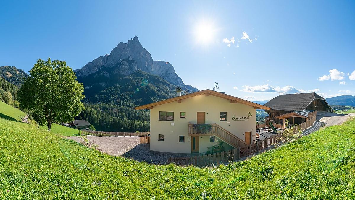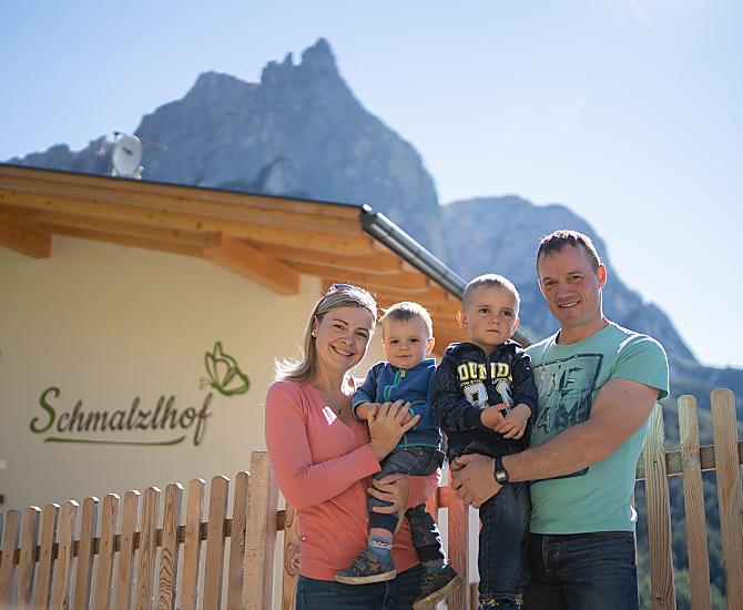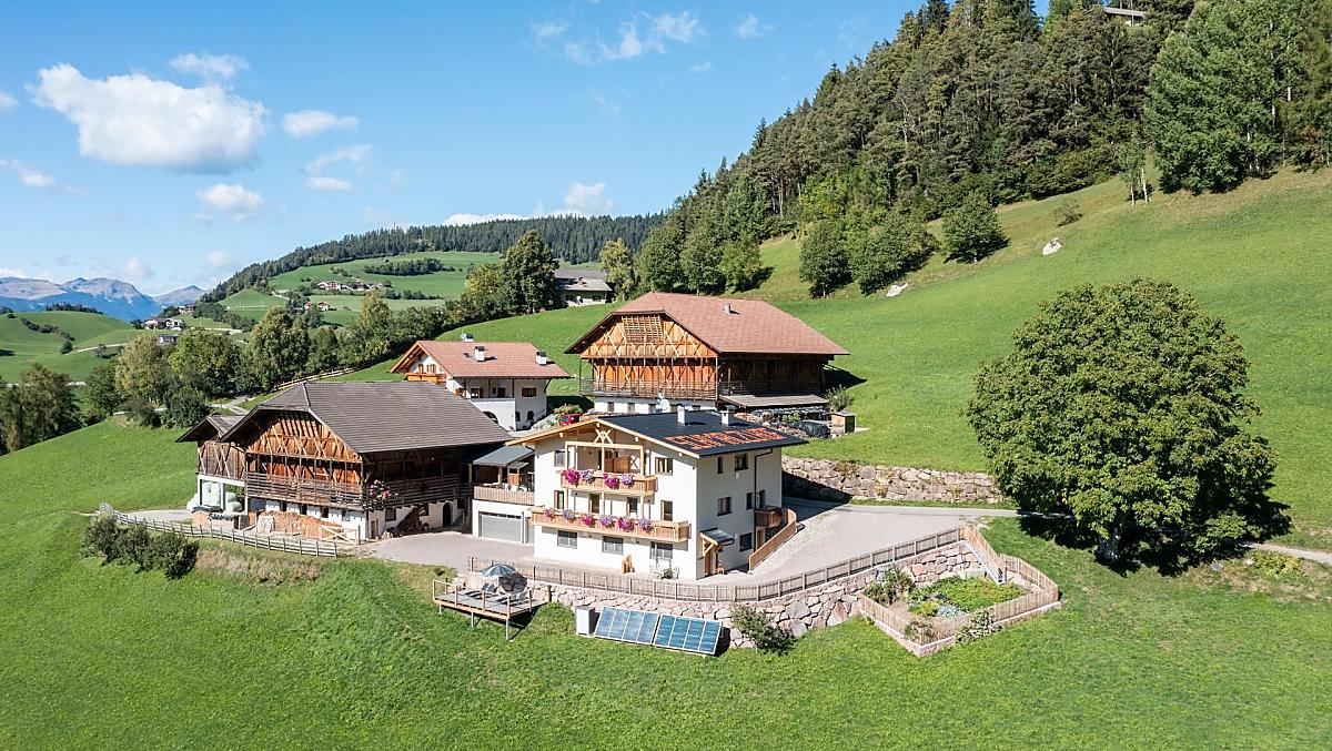Auf unserem Bauernhof, mitten im Herzen Südtirols, leben wir, Oswald und Angelika, mit unseren Söhnen Samuel und Matthias und mit unseren Simmental-Milchkühen, Kälbern und Kälbchen. Sie teilen sich den Stall mit den Zwergziegen und den Hühnern. Auch unsere Katzen kommen im Stall oft zu Besuch, besonders wenn sie von Oswald gefüttert werden wollen. Insgesamt bearbeiten wir 3 Hektar Wiesen am Hof, 3 Hektar auf der Seiser Alm als Eigentum und 4 Hektar in Pacht. So erhalten wir den Großteil des Futters für unsere Tiere. Seit 2021 haben wir in unserem neuen Bauernhaus drei unterschiedlich große Ferienwohnungen. Alle drei Wohnungen sind Richtung Süden ausgelegt und bieten einen herrlichen Blick auf den Schlern. Südwestlich kann auf die Wiesen des Bauernhofes, auf der Ostseite auf Wälder und Richtung Seiser Alm geblickt werden. Von unserem Bauernhof aus können unsere lieben Gäste zahlreiche Wanderungen beginnen oder auf der Sonnenterrasse die Seele baumeln lassen und die Natur genießen.