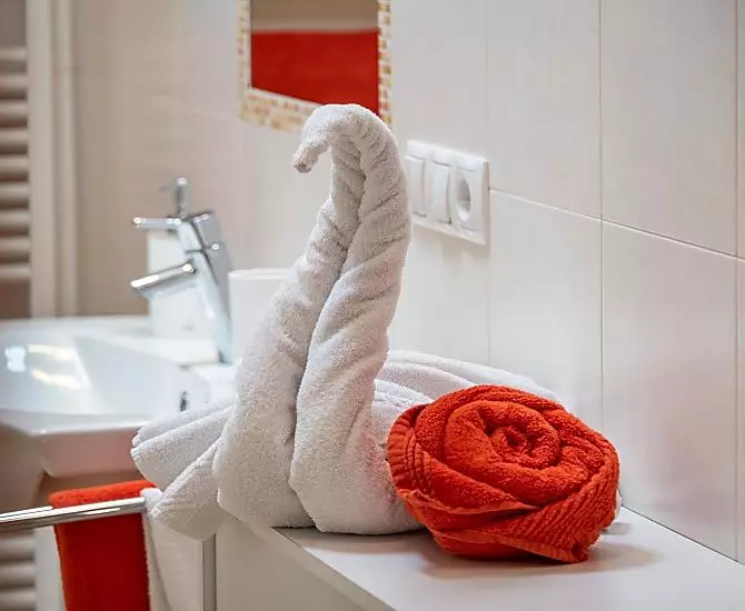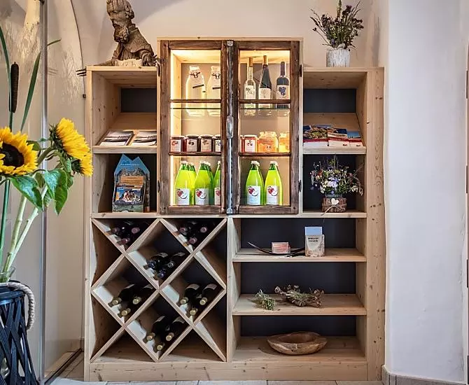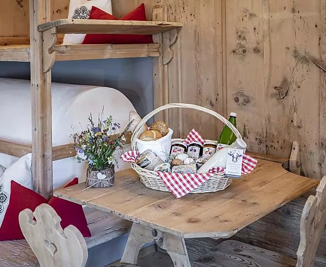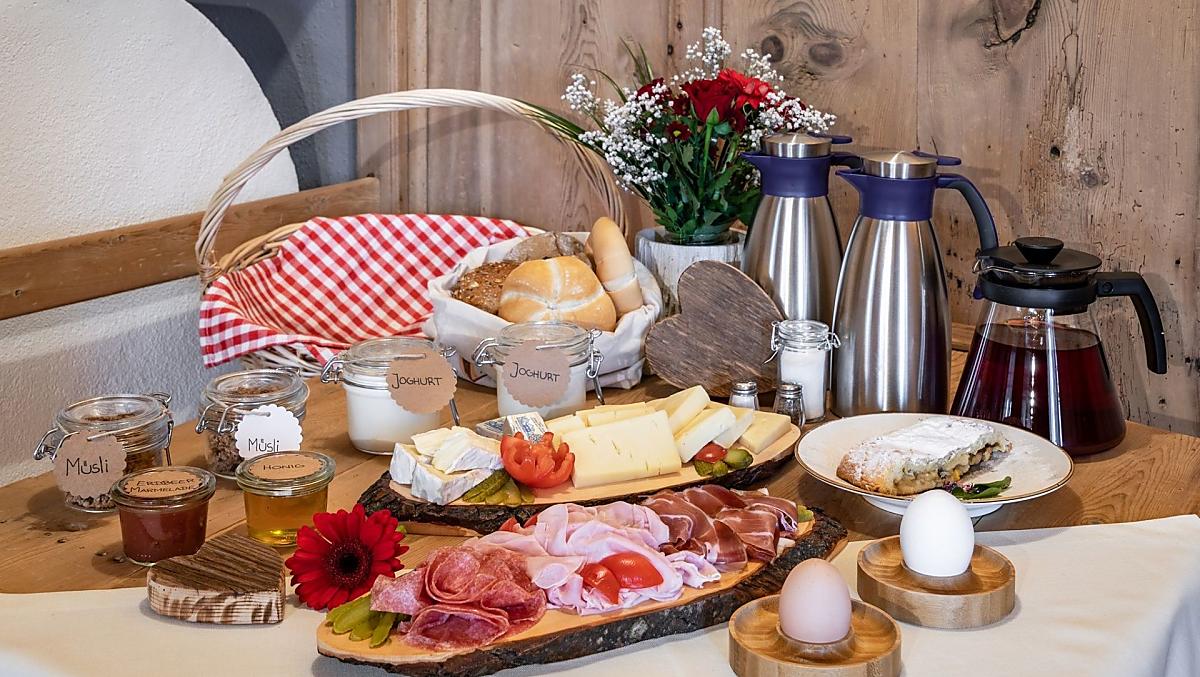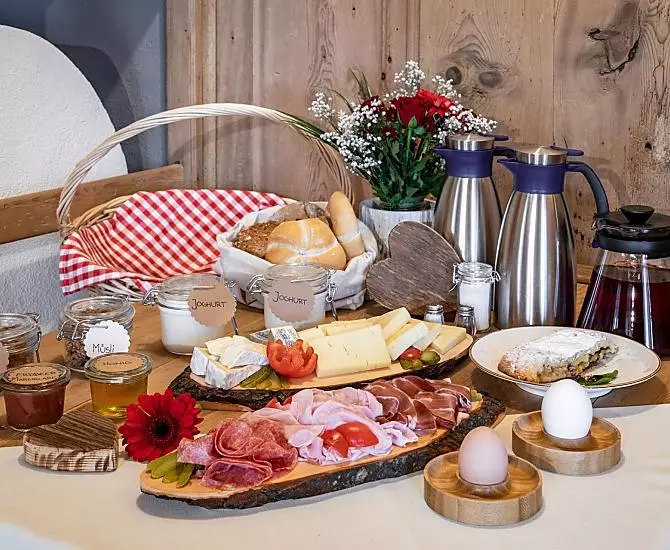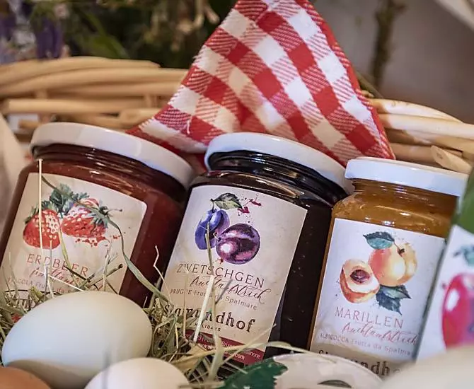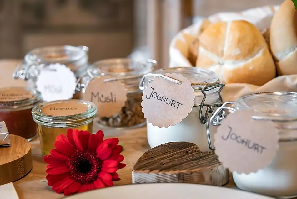 - Hofeigene Produkte beim Frühstück: Milch, Eier, Honig, Fruchtaufstriche, Fruchtsäfte, Backwaren, Frisches Obst je nach Saison