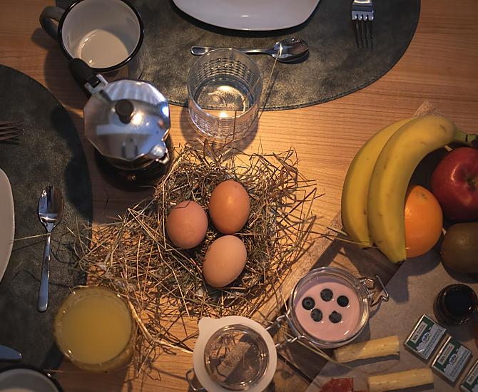 - Hofeigene Produkte beim Frühstück: Speck, Würste, Eier, Fruchtaufstriche, Sirup, Kräutergewürze, Backwaren, Frisches Gemüse je nach Saison, Frisches Obst je nach Saison