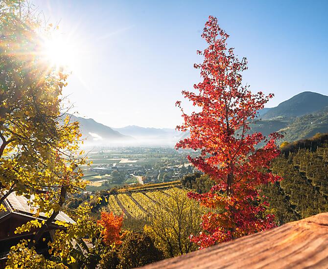 Der Bio-Bauernhof liegt ruhig inmitten von Apfel- und Weingärten oberhalb von Tscherms. Ein Ort zum Ankommen, Durchatmen und Entspannen. Umgeben von Natur genießt ihr hier erholsame Ruhe mit Blick auf die umliegende Bergwelt, während Tscherms und die Kurstadt Meran in wenigen Minuten erreichbar sind.