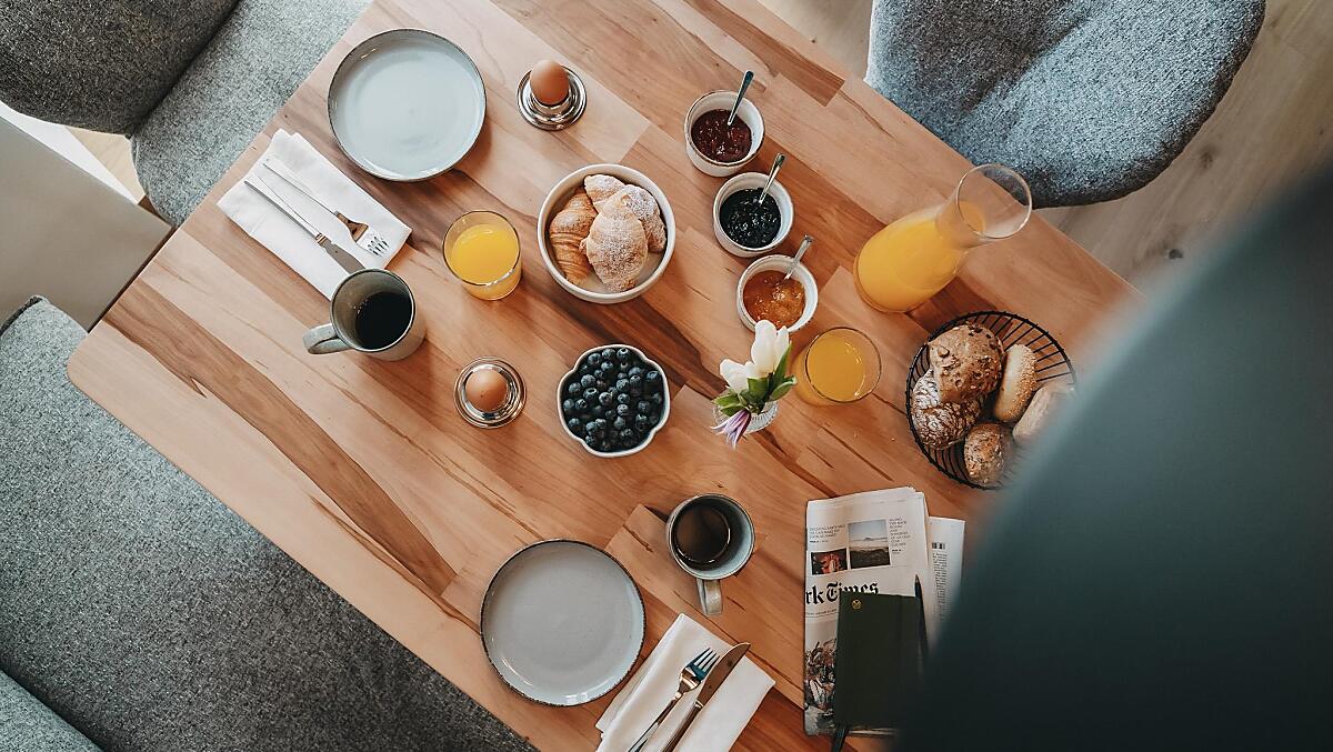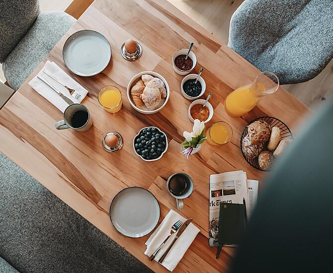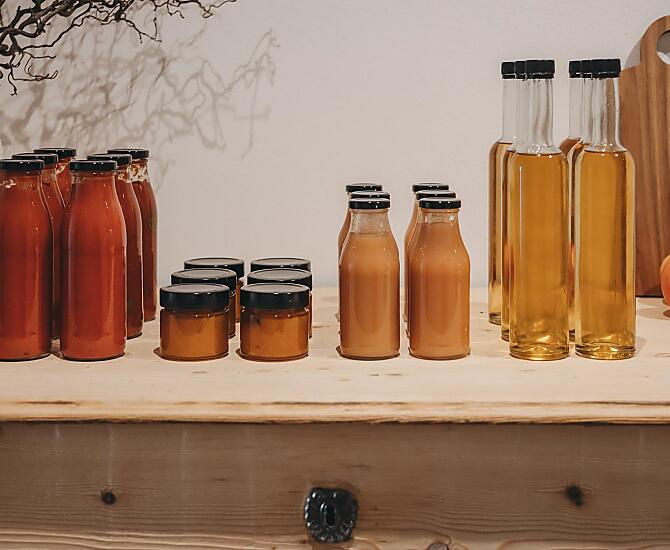 - Hofeigene Produkte beim Frühstück: Fruchtaufstriche, Sirup, Fruchtsäfte, Trockenobst, Eingelegtes, Kräutertee, Backwaren, Frisches Gemüse je nach Saison, Frisches Obst je nach Saison