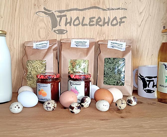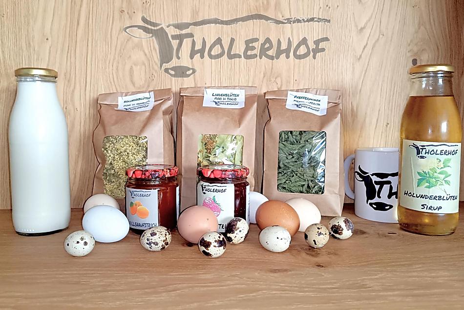 - Hofeigene Produkte beim Frühstück: Milch, Joghurt, Käse, Butter, Speck, Eier, Honig, Fruchtaufstriche, Sirup, Fruchtsäfte, Trockenobst, Kräutertee, Brot, Backwaren, Frisches Gemüse je nach Saison, Frisches Obst je nach Saison