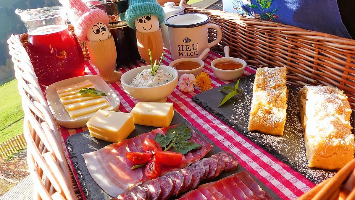 - Hofeigene Produkte beim Frühstück: Speck, Eier, Fruchtaufstriche, Sirup, Kräutergewürze, Brot, Backwaren, Frisches Gemüse je nach Saison, Frisches Obst je nach Saison