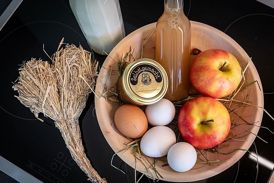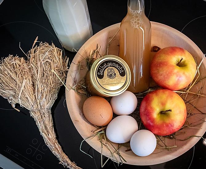 - Hofeigene Produkte beim Frühstück: Milch, Joghurt, Eier, Honig, Fruchtaufstriche, Sirup, Trockenobst, Kräutertee, Backwaren, Frisches Gemüse je nach Saison, Frisches Obst je nach Saison