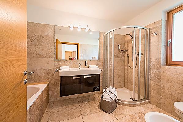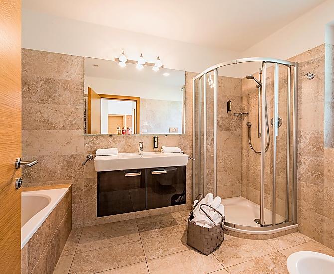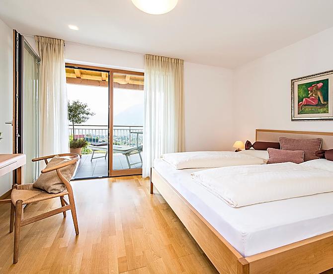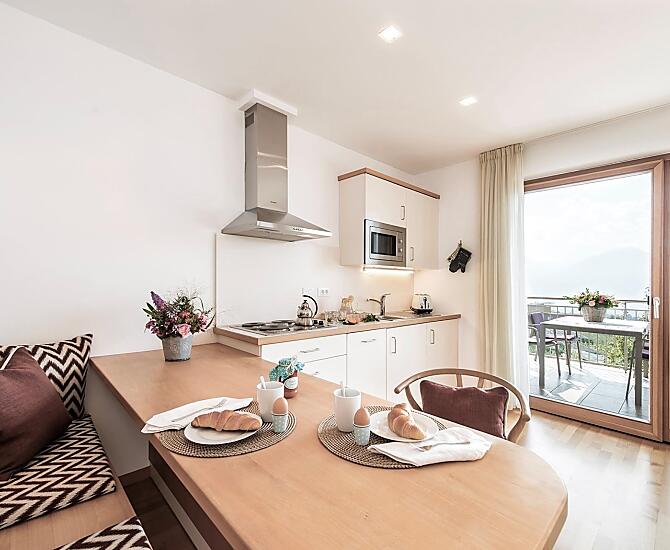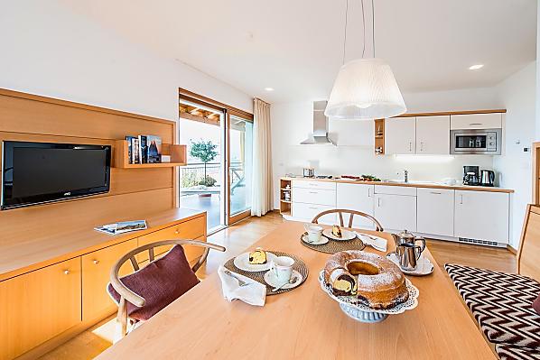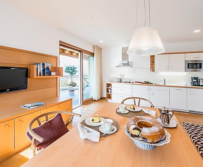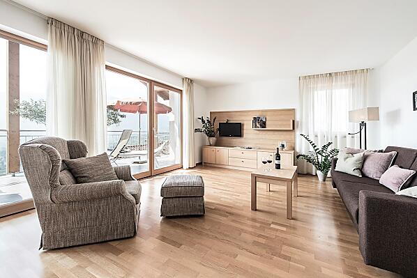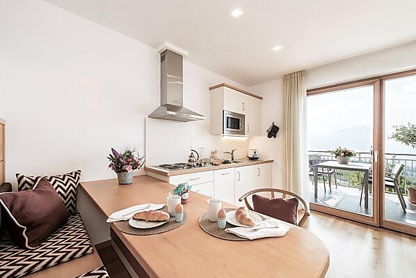 Im Apartment holen große Fenster die Natur ins Haus. Ein Highlight ist die große, sonnige Terrasse zur Südseite. Der beheizte Pool mit mediterraner Liegewiese ist nach langen Wanderungen ein wohltuender Ort zum "dolce far niente". Abends finden Sie kleine Wirtshäuser, Pizzerias oder Restaurants in der Umgebung.