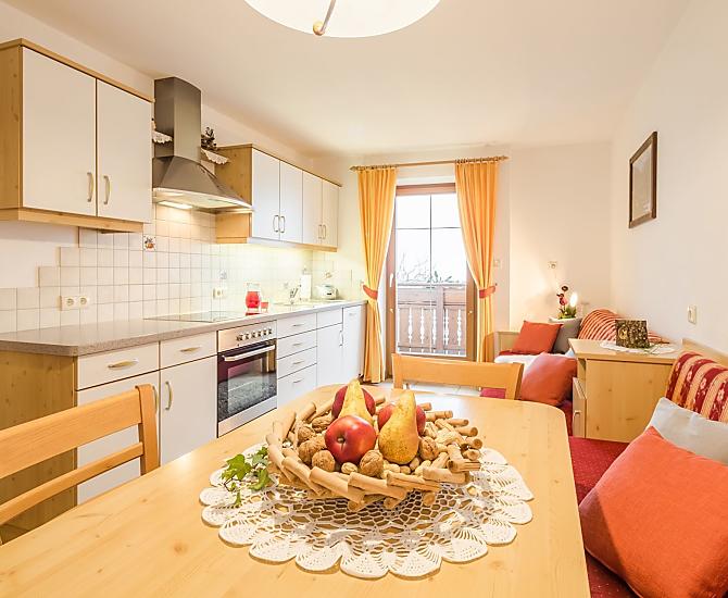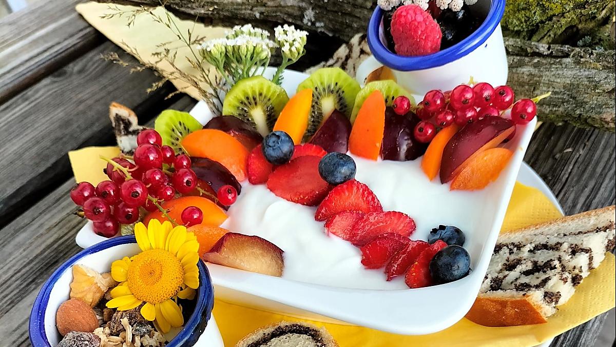 - Hofeigene Produkte beim Frühstück: Milch, Joghurt, Käse, Butter, Speck, Würste, Eier, Fruchtaufstriche, Sirup, Kräutertee, Kräutergewürze, Frisches Gemüse je nach Saison, Frisches Obst je nach Saison