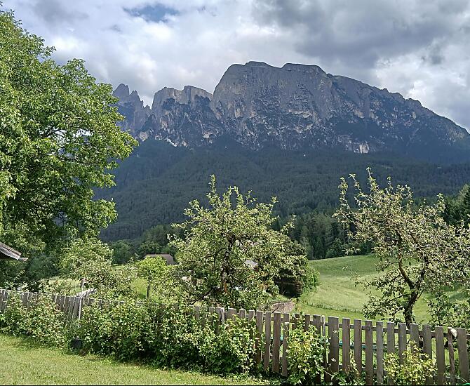 Unser traditioneller Bauernhof liegt auf rund 1.000 m Höhe, ruhig und sonnig, mit einem herrlichen Ausblick auf das idyllische Dorf Seis am Schlern, das Eisacktal und den majestätischen Schlern.