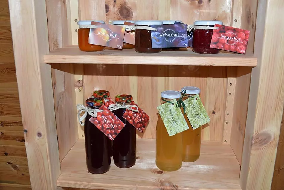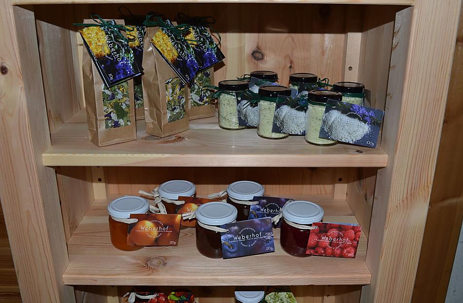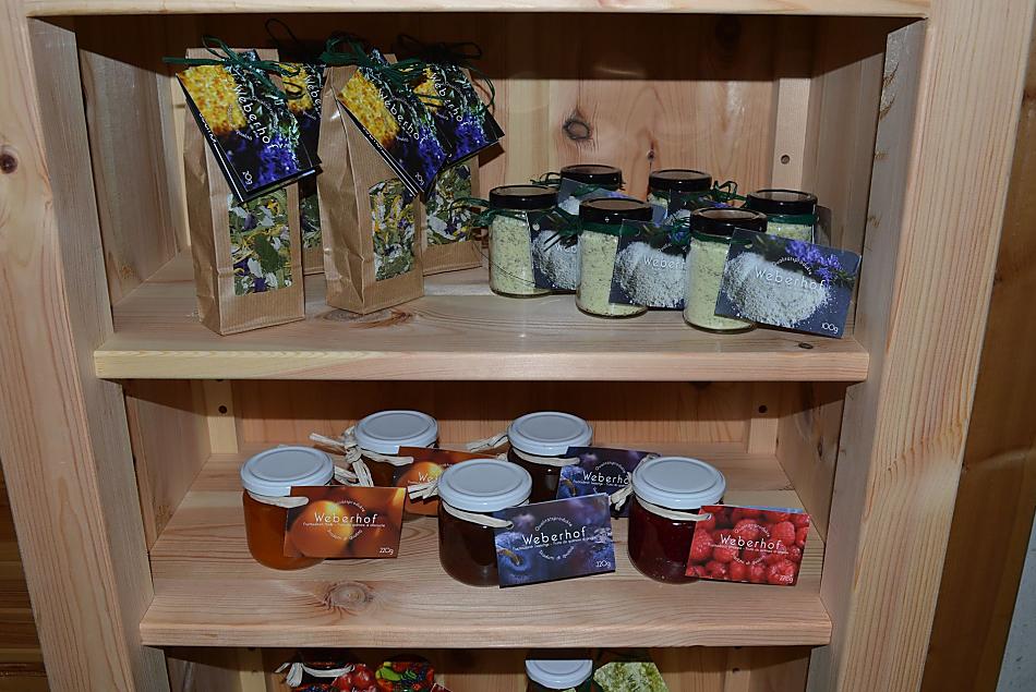 • Hofeigene Produkte beim Frühstück: Speck, Geselchtes Rindfleisch, Würste, Eier, Fruchtaufstriche, Sirup, Gelees, Kräutertee, Kräutergewürze, Brot, Backwaren, Frisches Obst je nach Saison