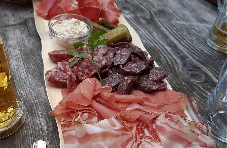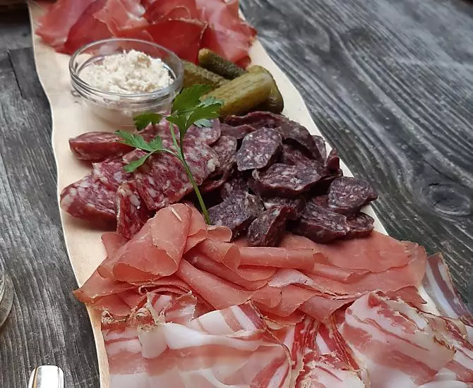 - Hofeigene Produkte beim Frühstück: Milch, Käse, Speck, Eier, Fruchtaufstriche