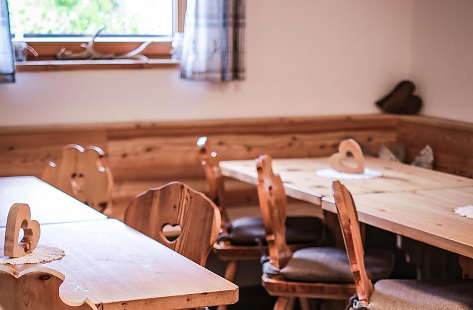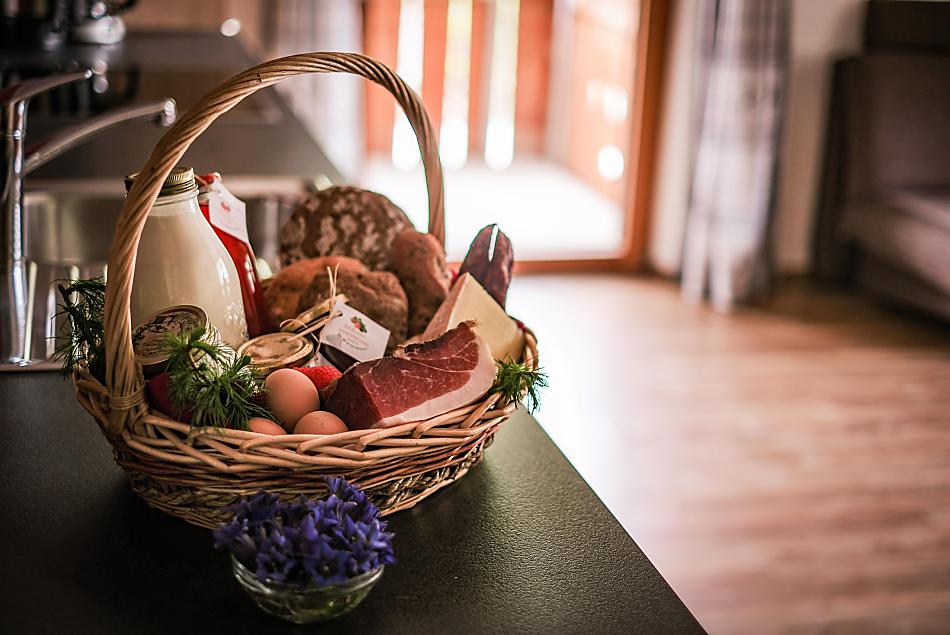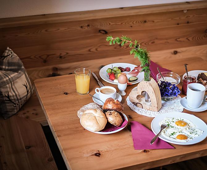 - Hofeigene Produkte beim Frühstück: Milch, Joghurt, Käse, Butter, Andere Milchprodukte, Speck, Würste, Eier, Honig, Fruchtaufstriche, Sirup, Fruchtsäfte, Kräutertee, Brot, Frisches Gemüse je nach Saison, Frisches Obst je nach Saison