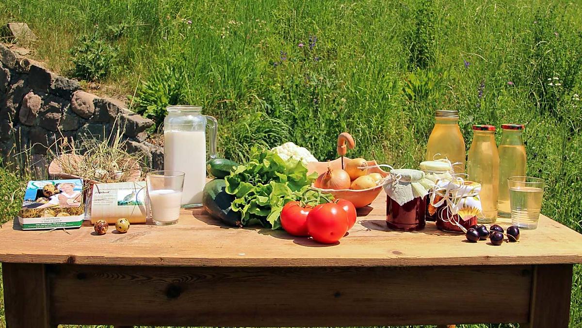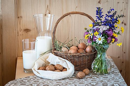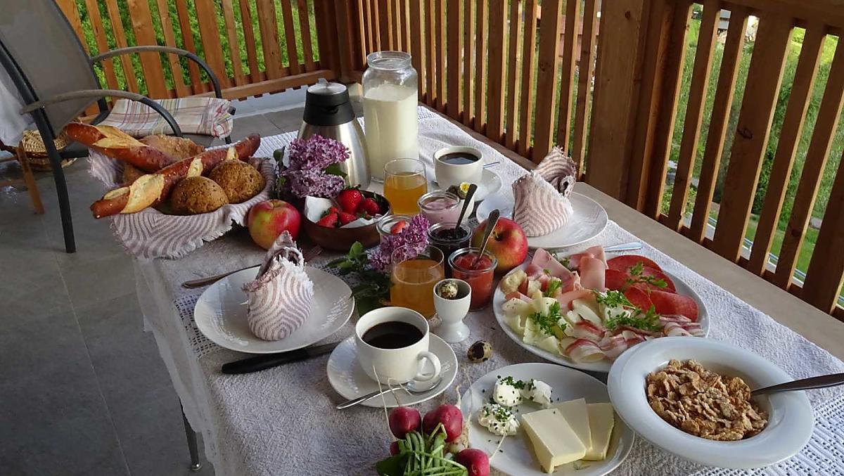 - Hofeigene Produkte beim Frühstück: Milch, Eier, Fruchtaufstriche, Fruchtsäfte, Frisches Gemüse je nach Saison, Frisches Obst je nach Saison