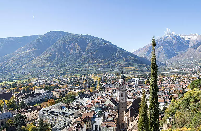 Die Kurstadt Meran überzeugt mit ihrem milden Klima und ihrem alpinen Flair. Immerhin reicht das Stadtgebiet vom Talkessel auf 263 Metern bis auf eine Höhe von 1.621 Metern. Das Stadtbild prägen Palmen und Zypressen, im Hintergrund imponieren schneebedeckte Gipfel. Die zweitgrößte Stadt Südtirols liegt am Zusammenfluss von Etsch und Passer – vier große Täler kommen hier zusammen: der Vinschgau, das Etschtal, das Passeiertal und das Ultental. Zu Meran gehören die Ortsteile Gratsch, Obermais, Untermais, Labers und Sinich.