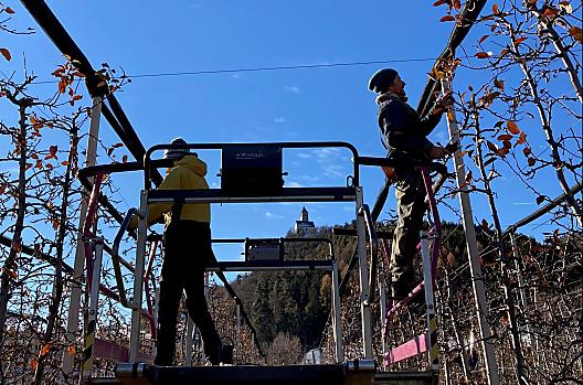 As soon as the trees begin to bloom, the farmer gets to work to protect his harvest. If the temperatures drop at night, the so-called frost sprinkling must be activated when the temperatures drop below zero. The fruit growers in South Tyrol use their irrigation systems for this. The trees are watered, the flowers freeze and remain intact. Thanks to the "ice mantle", the temperature of the apple blossoms never falls to a dangerous level. The farmers keep watch in the spring and keep each other informed. If the temperatures drop to around 0 degrees Celsius, a siren sounds to warn of the danger in the orchards. The modern farmers have installed an app on their mobile phones that warns them of frost. The next morning, the frozen apple trees gleam in the sun. A spectacle that is not only beautiful, but also extremely important.