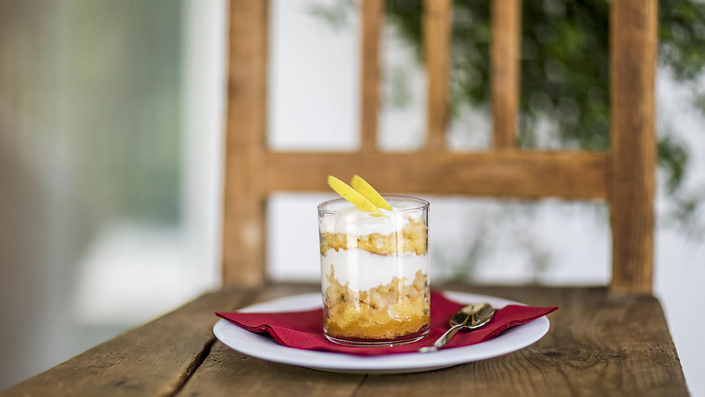 StepCut out rounds from the biscuit base. Form layers of biscuit rounds, apple cubes and crème in a glass. -