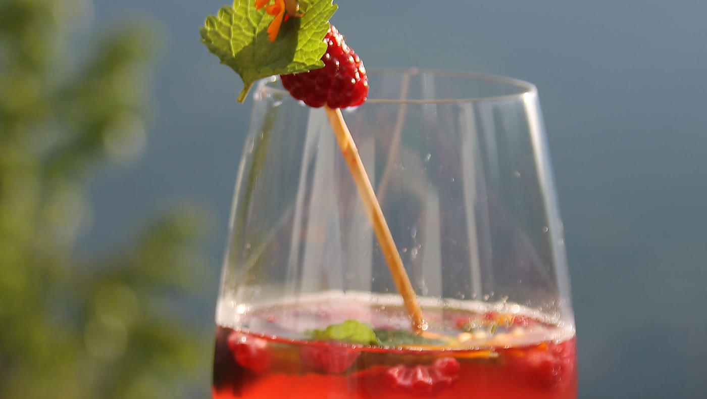A refreshing aperitif with raspberry syrup and fresh herbs. Raise a glass on hot summer days!