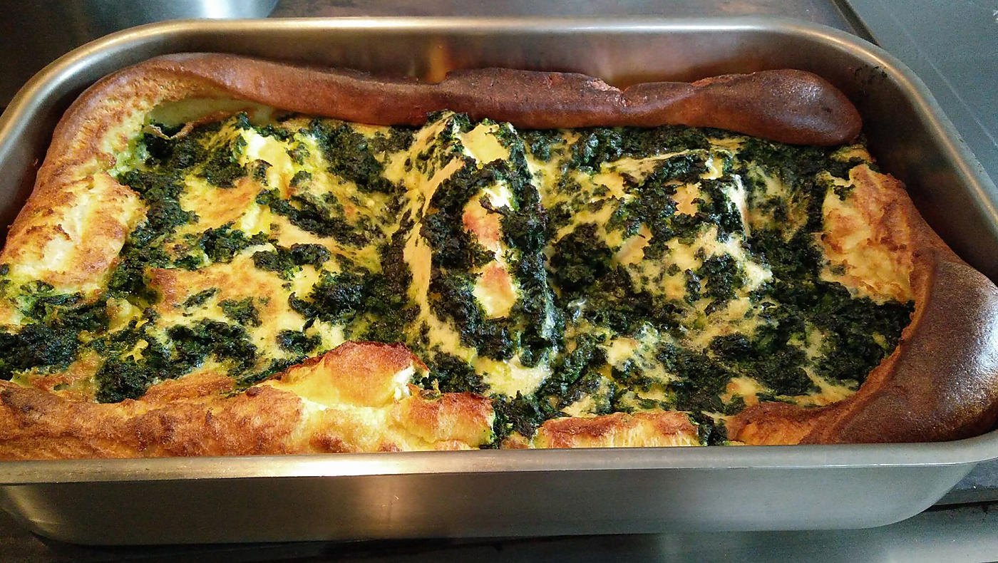 StepPut in pre-heated oven and bake at 220 °C (or 200 °C with a fan oven) until the spinach 'Tschutsch' looks like a moonscape. -