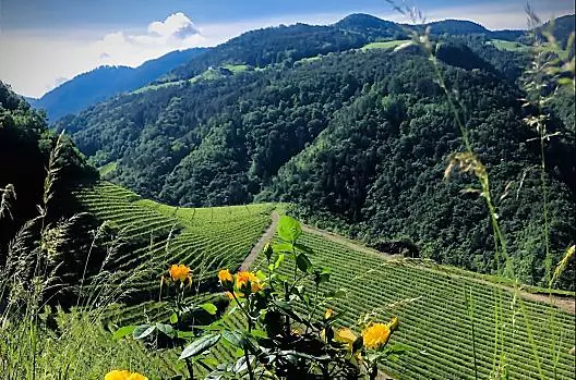 The vineyards in South Tyrol extend from Vinschgau over Etschtal valley down to the southernmost part of the region and over Eisacktal valley up to the Brixner valley basin. The landscape in these areas is largely made up of pergolas and arbours, in which the farmers grow their vines. The wine-growing regions are characterized above all by their diverse scenery. The grape varieties are equally varied. Three important wines have their origins in South Tyrol: Lagrein, which is becoming increasingly popular, Vernatsch, the most common South Tyrolean red wine, and Gewürztraminer, which is inseparably linked to the wine village of Tramin.