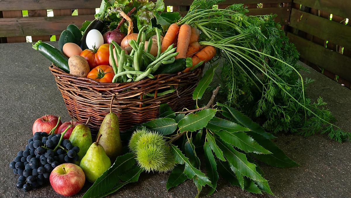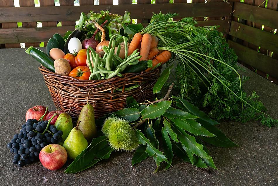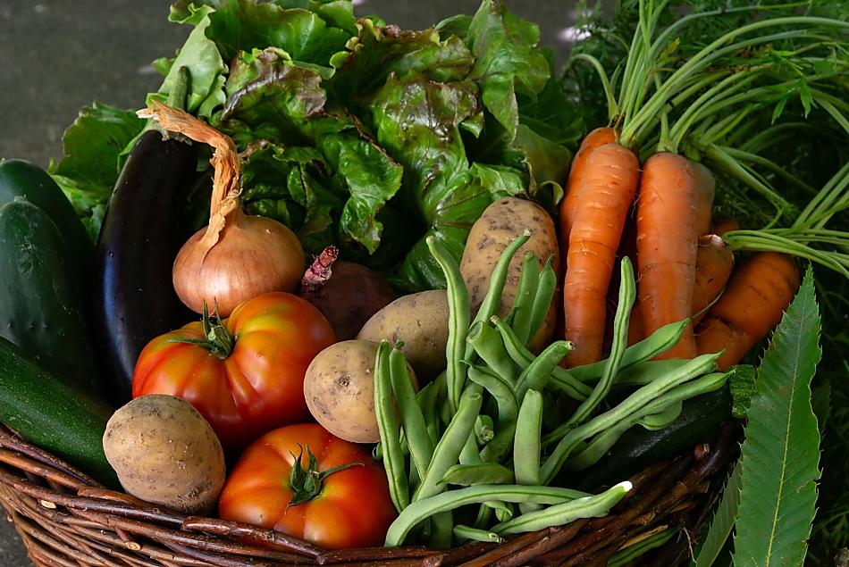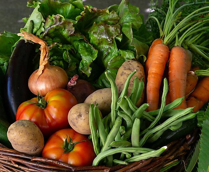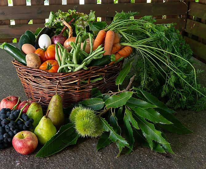 - fresh vegetables in season (asparagus, aubergine, beans, beetroot, cabbage, carrots, celery, courgettes, cucumbers, fennel, kohlrabi, leek, lettuce, onions, peppers, pumpkin, radicchio, radishes, Swiss chard, tomatoes)