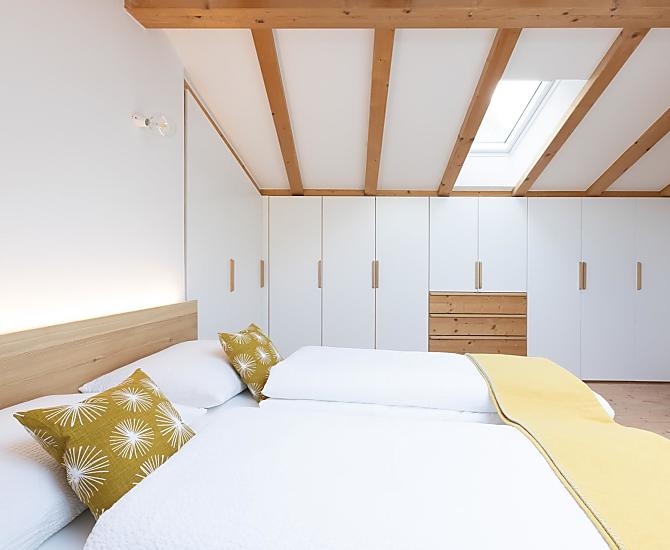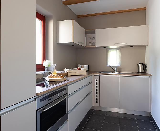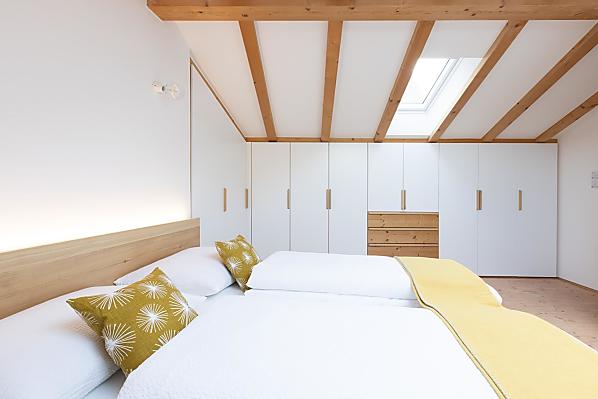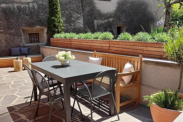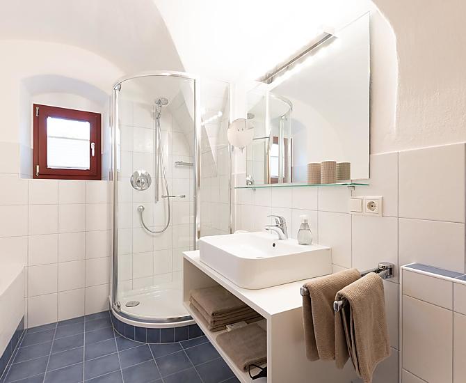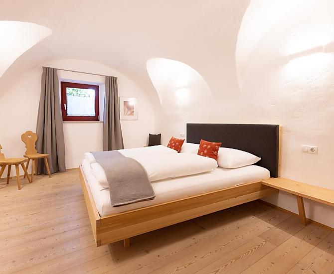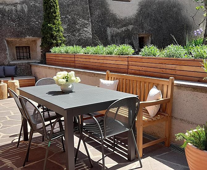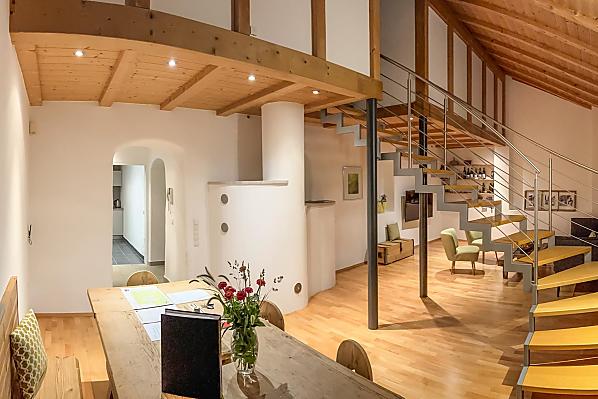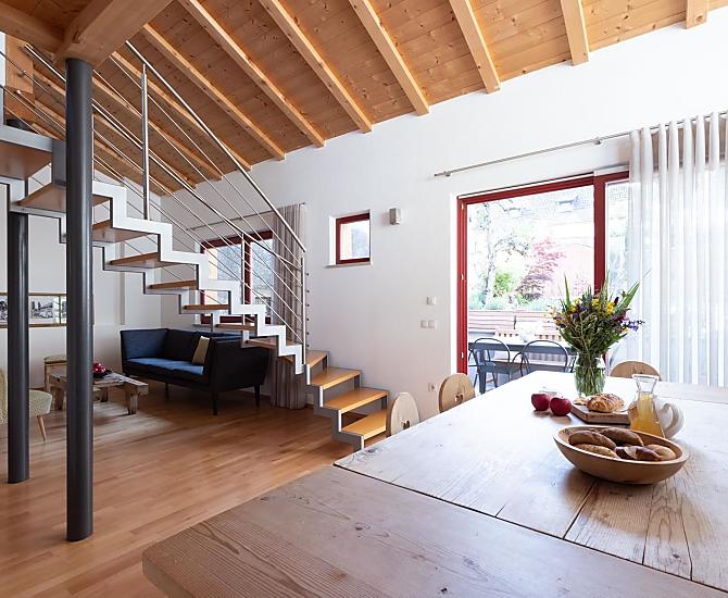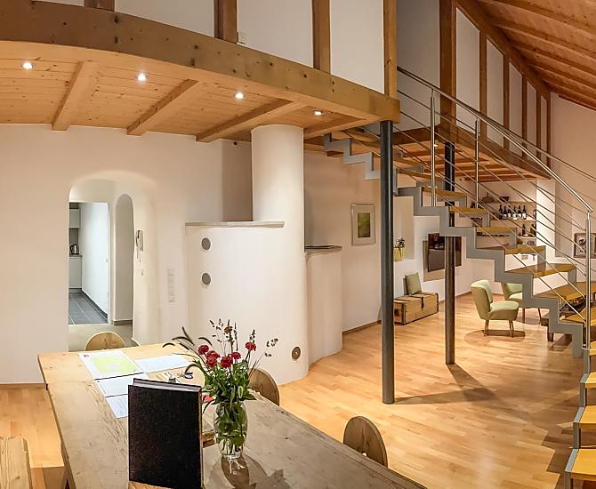 Our lovingly renovated holiday home is partly located in the idyllic courtyard of our Ansitz Pastreinbach and opens to the west with a beautiful view of the surrounding vineyards and the Mendelkamm mountain ridge. It has direct access to our large garden full of blossoming flowers, shrubs and fruit trees and the newly planted vineyard.
