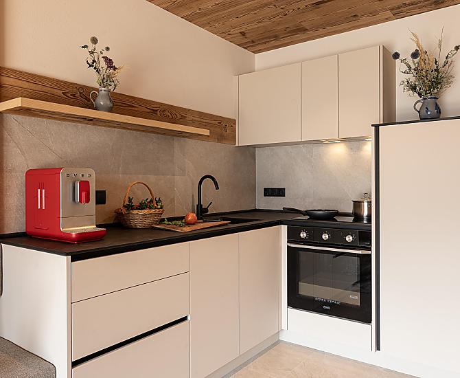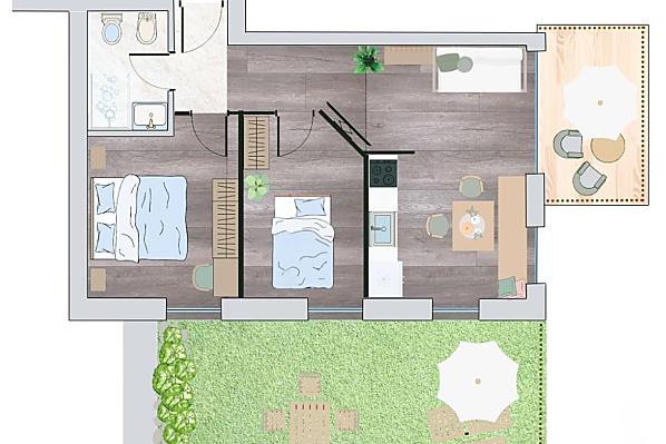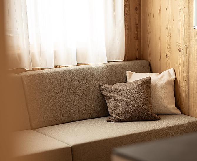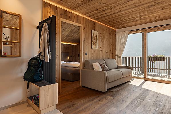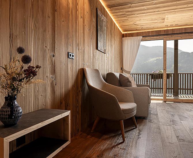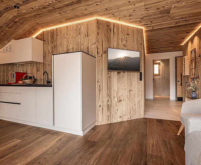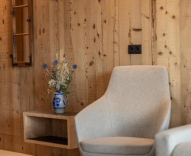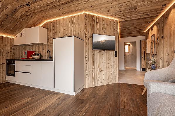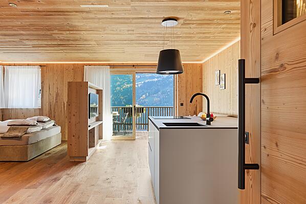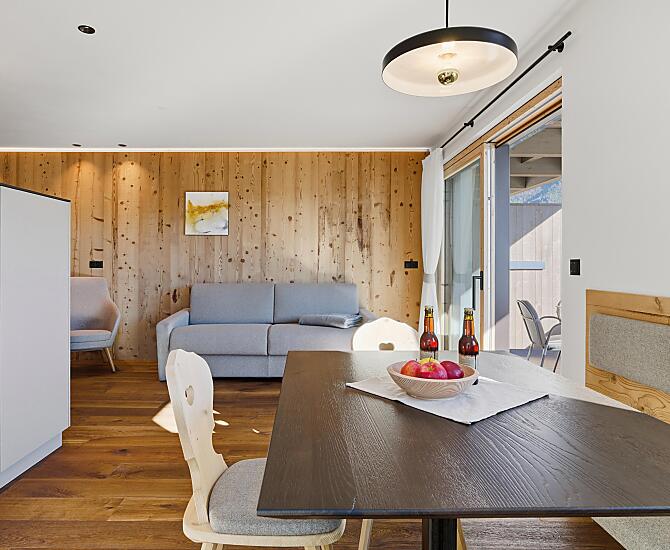 The stylishly furnished flats with private terrace combine modern comfort with alpine charm. The lovingly designed outdoor area and the exclusive wellness area with sauna and relaxation room invite you to pamper body and soul.