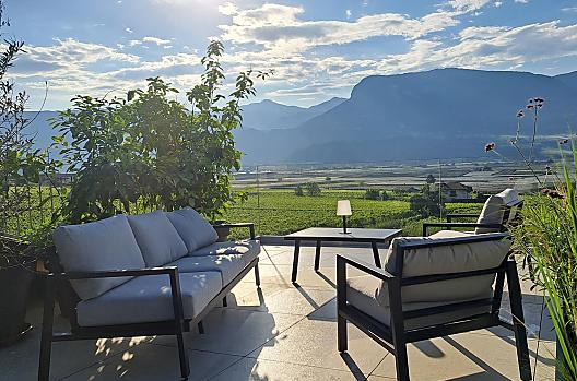 Fruit and wine farm surrounded by vineyards with a beautiful panoramic view of the surrounding mountains and the South Tyrolean Unterland area. There is a pool with jacuzzi function on the roof terrace.