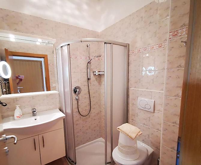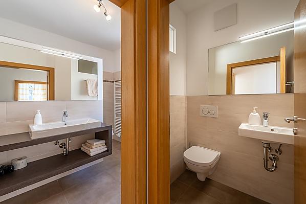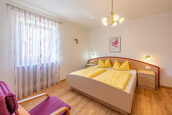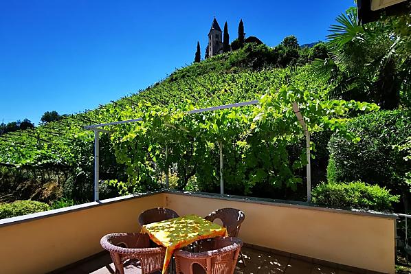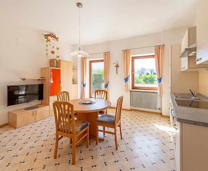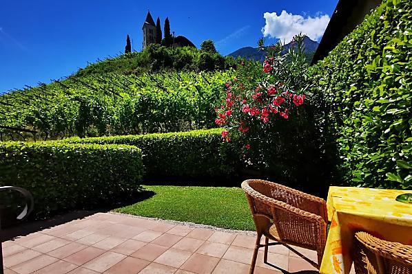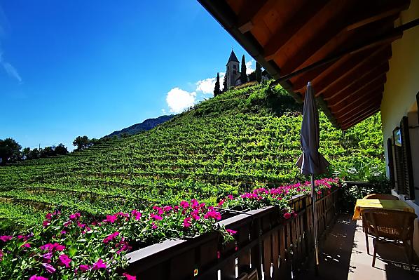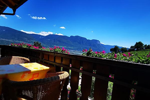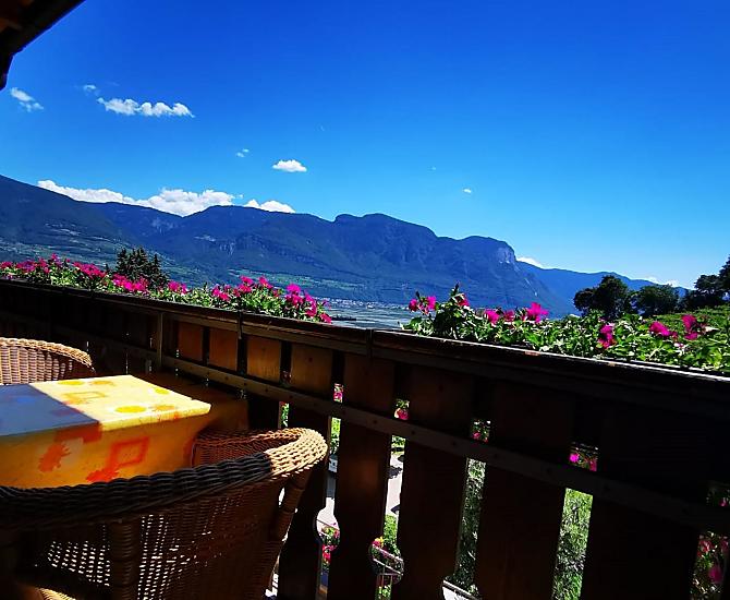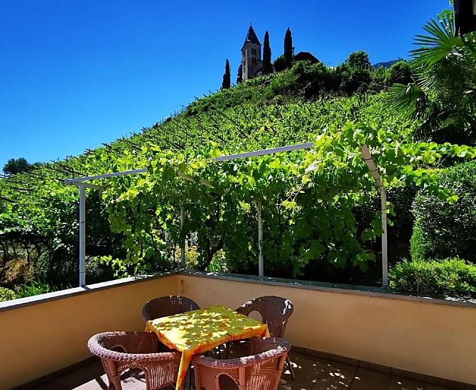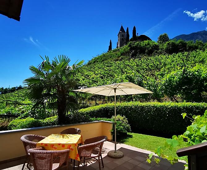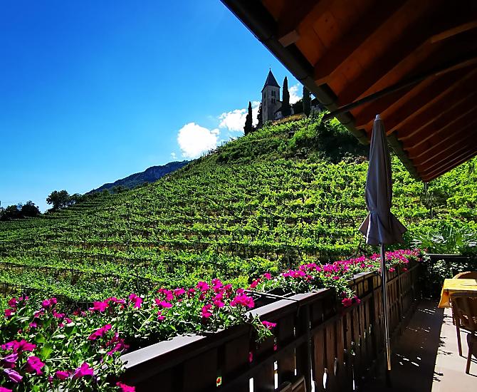 Our holiday farm is in a sunny, quiet and central location, surrounded by vineyards, below the Kastellaz hill in the middle of Tramin. The box seat with a view of the romantic church of St. Jakob, our vineyards and the wide lowlands amazes every guest. There are spacious terraces and balconies available for our guests to sunbathe and relax. The inviting garden with its countless Mediterranean plants is also an oasis of well-being. Trampoline, table tennis, swing and sandbox are available for the children. Parking spaces with automatic entrance gates are available.