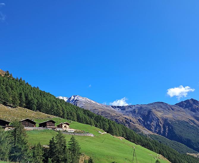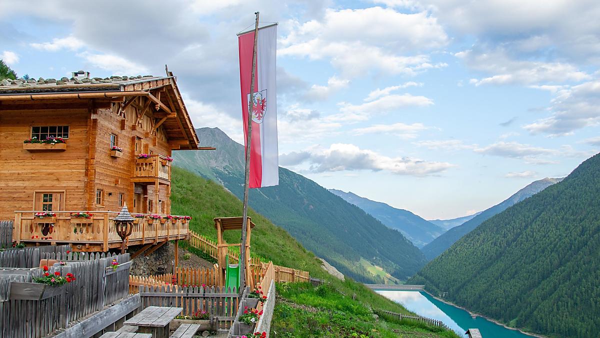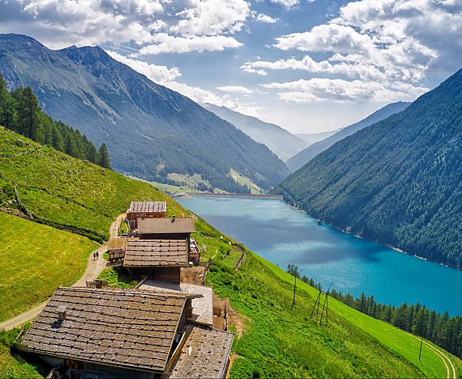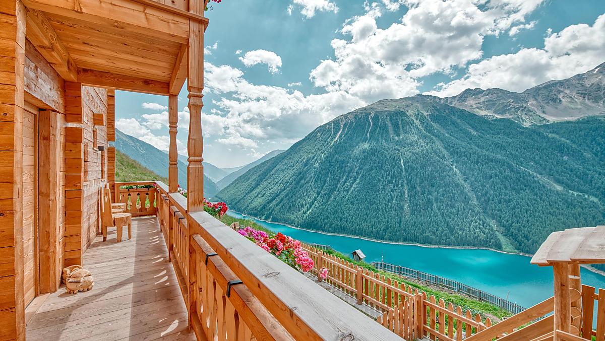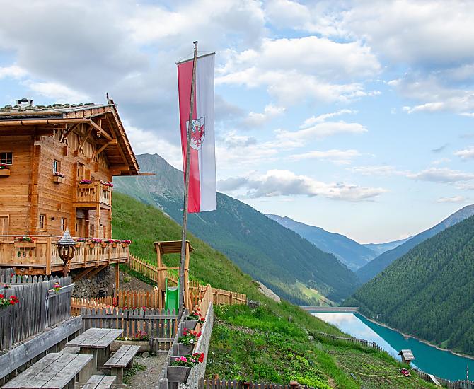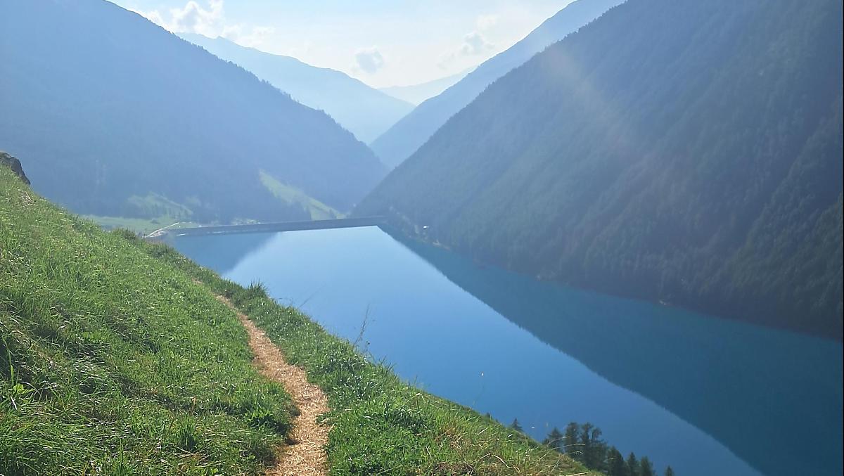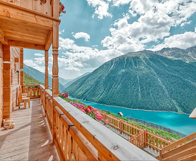 Our organic farm lies at 1,9974 m above sea level on the sunny side of Schnalstal valley, high above the Vernagter Stausee reservoir. You have a wonderful view of the reservoir and the surrounding mountains from the farm and you can see the Latemar mountain on the horizon.