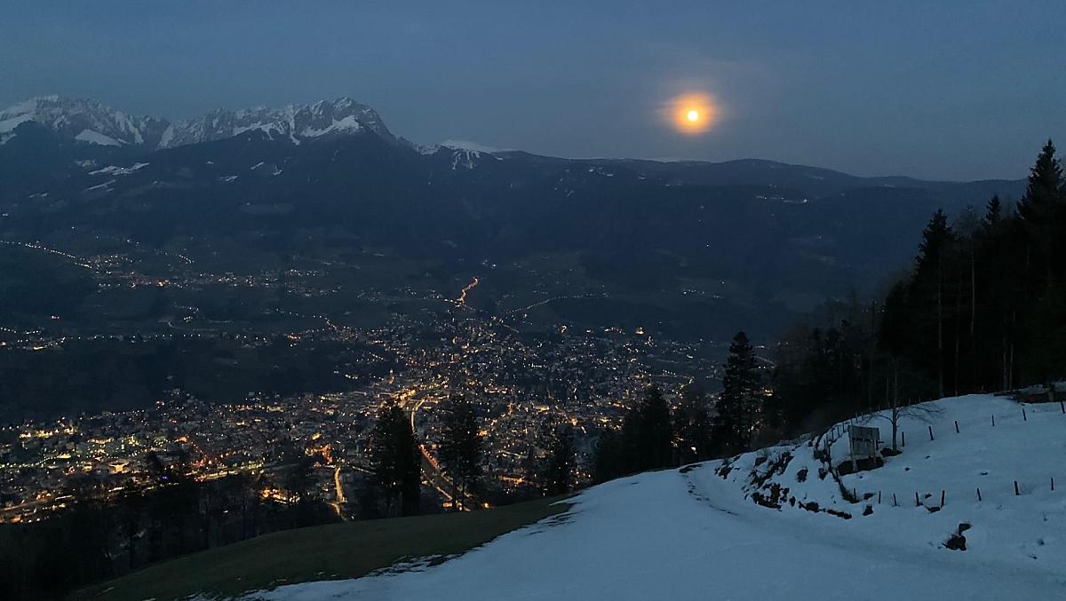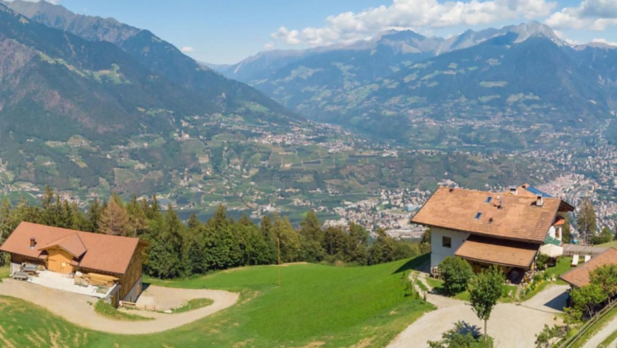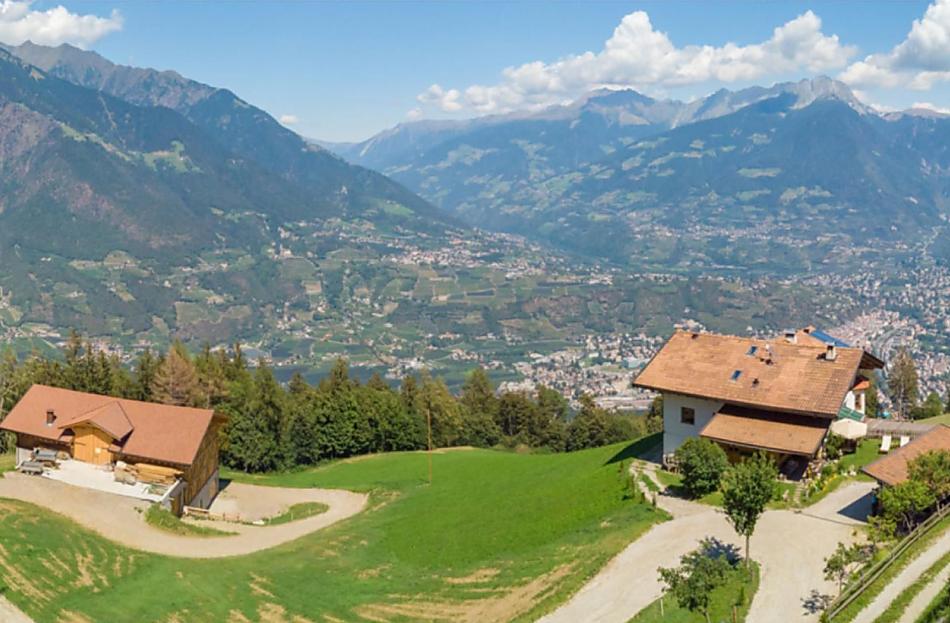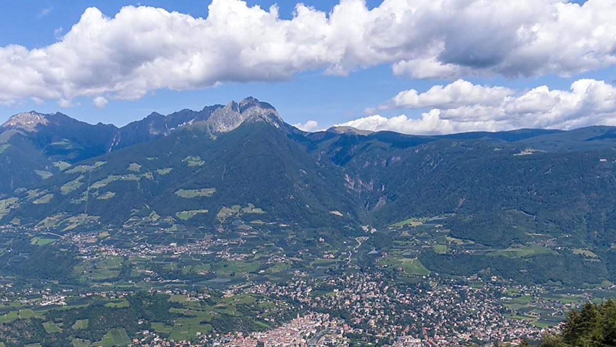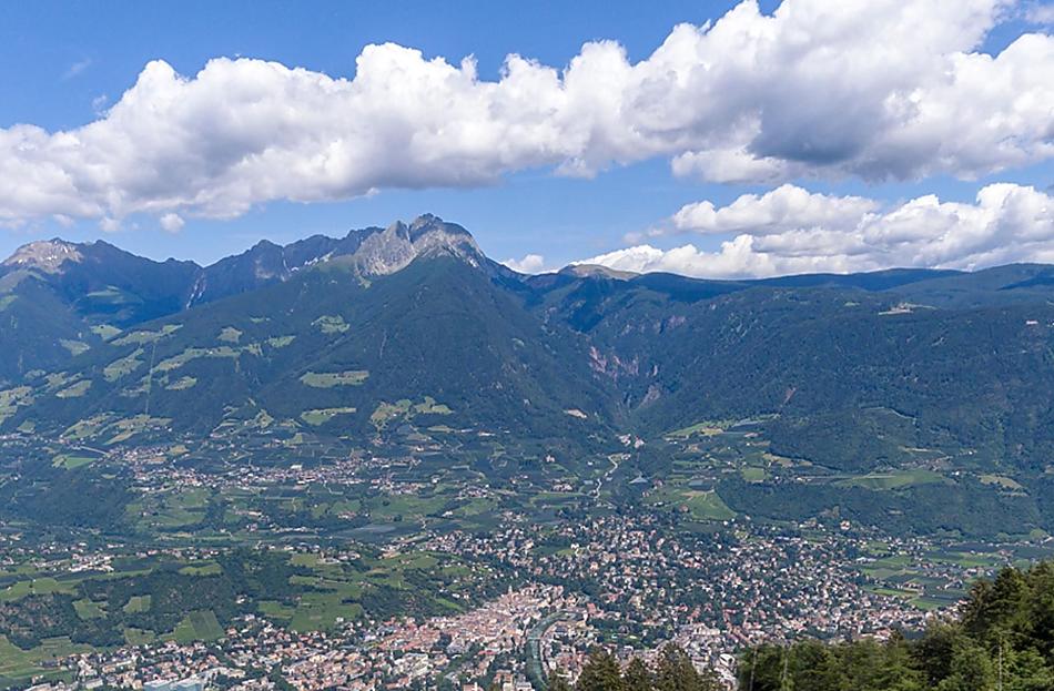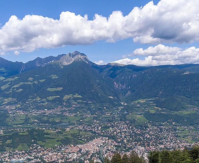 - Panoramic view over the Burggrafenamt and the mountains above.