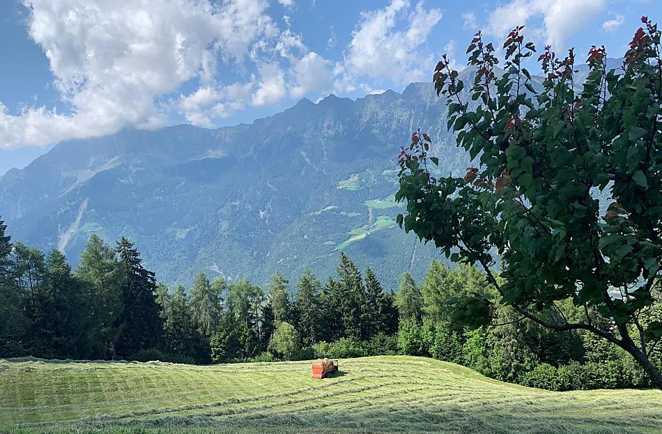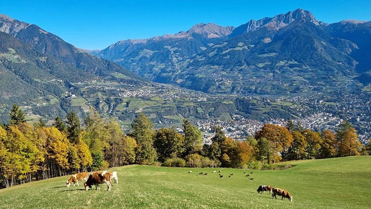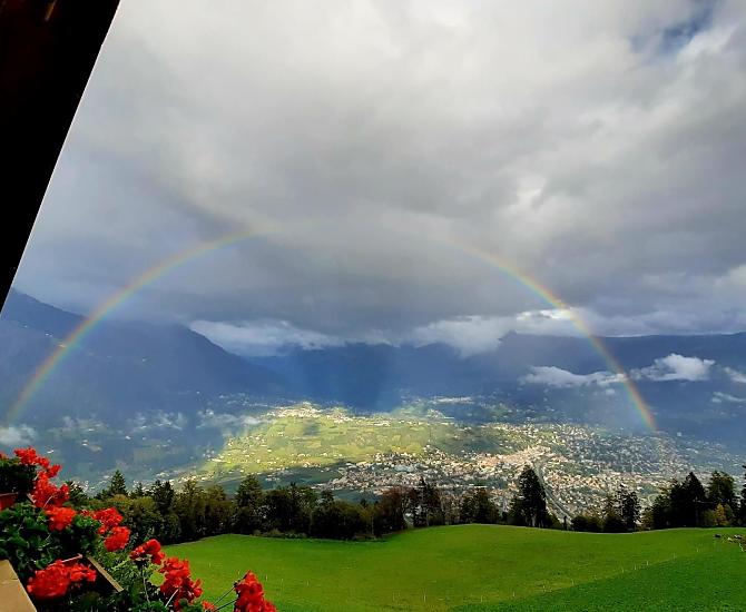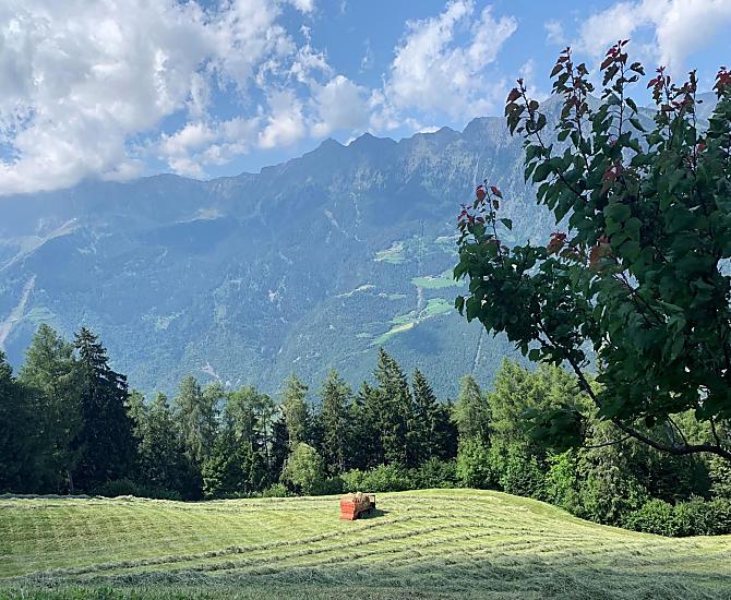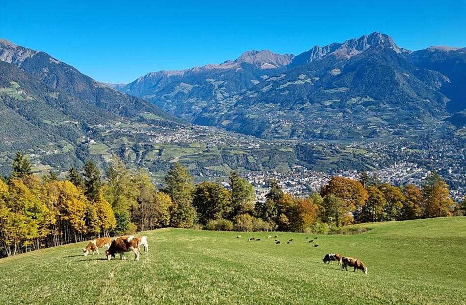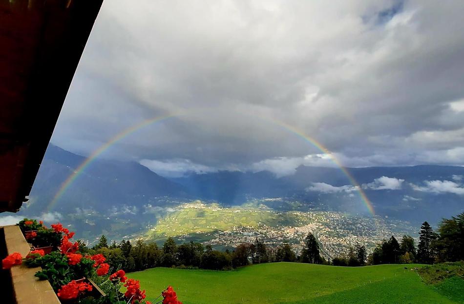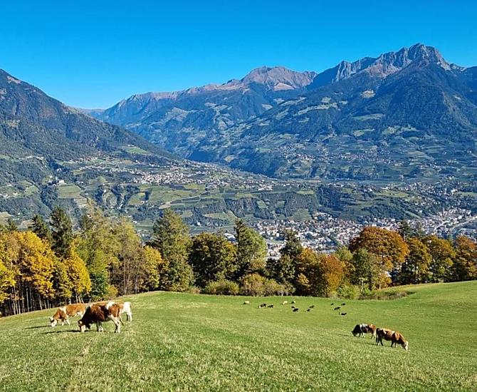 Our farm is nestled in lush meadows and fragrant forests at 1,000 m above the spa town of Meran with a wonderful panoramic view of the mountains, from Meran 2000 to the Ifinger, over the Hirzer to the Passeier valley and the Texelgruppe mountains. Our newly built stables provide shelter for our cows, goats, sheep, chickens, ducks, a pony, dog and cats.