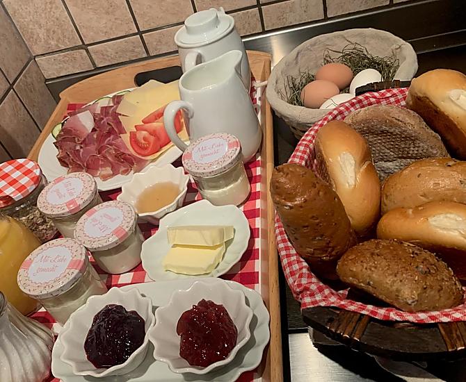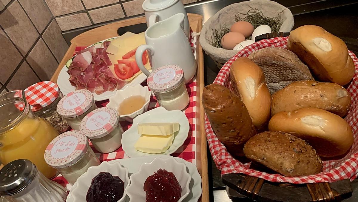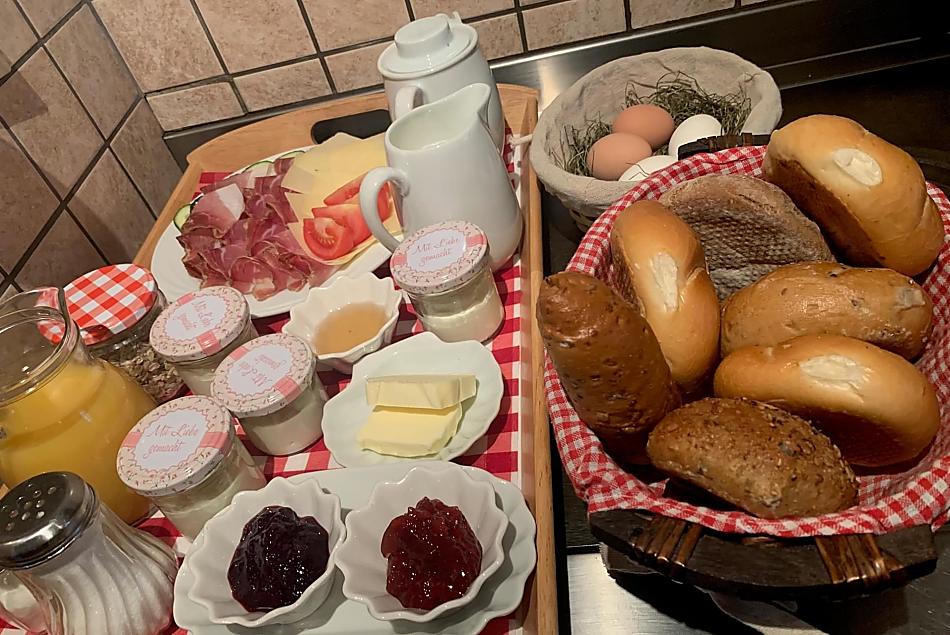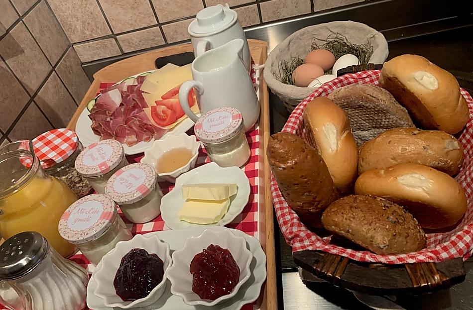 - Farm's own products at breakfast: milk, yoghurt, cheese, butter, speck, sausages, eggs, fruit jams, cordial, fruit juice, herb teas, seasoning, bread, baked goods, fresh vegetables in season, fresh fruit in season