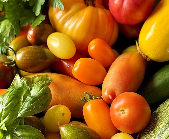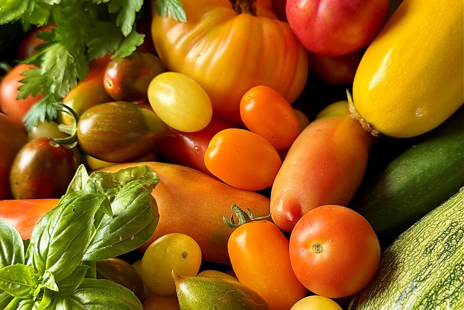 - fresh vegetables in season (aubergine, beetroot, cabbage, carrots, celery, courgettes, cucumbers, fennel, kohlrabi, leek, lettuce, onions, peppers, pumpkin, Swiss chard, tomatoes)