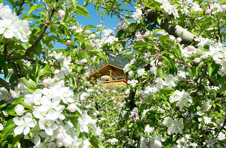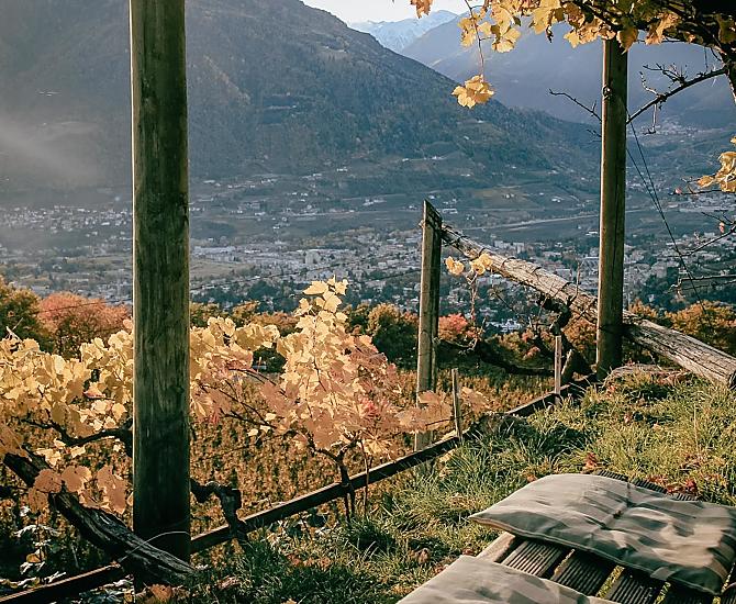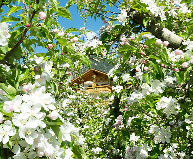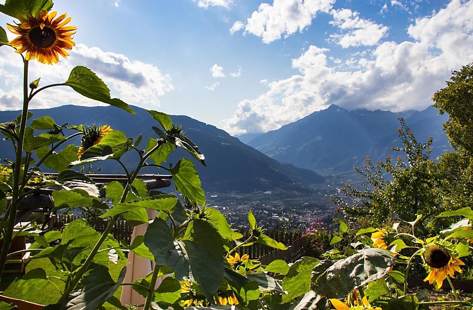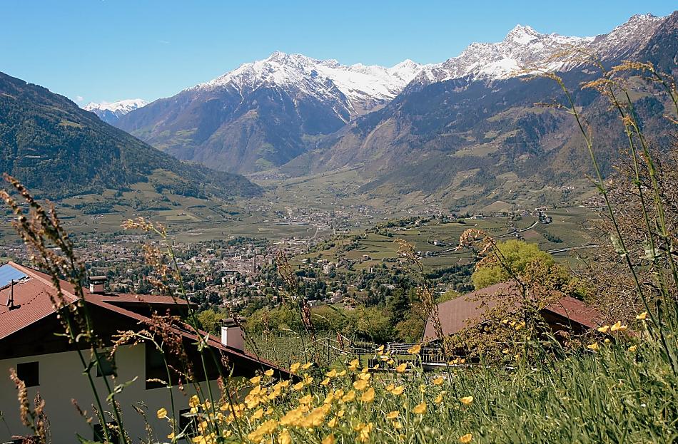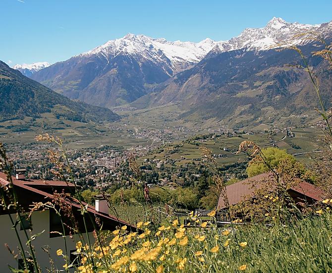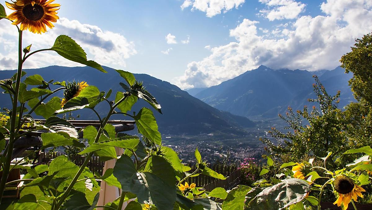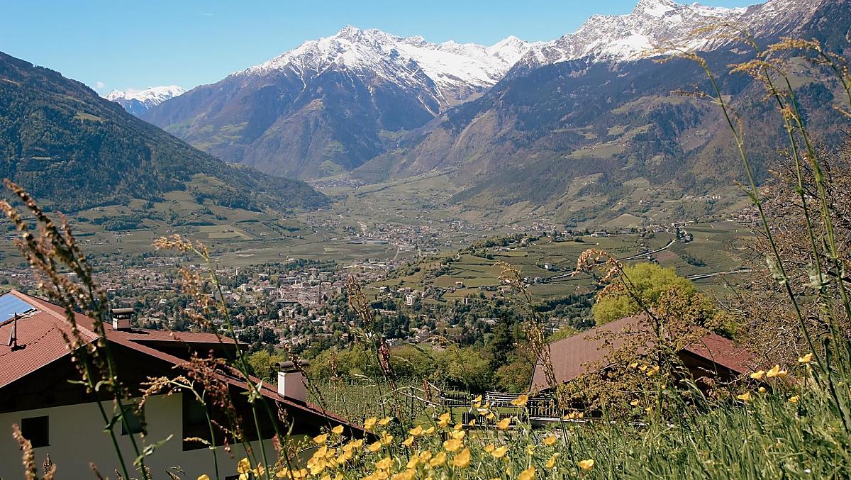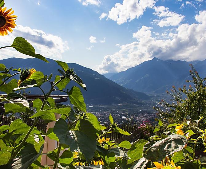 Our newly built farm is located in beautiful nature, on the sunny slopes of Meran, nestled in our own apple and hay flower meadows, just a few minutes' drive above the spa town of Meran.