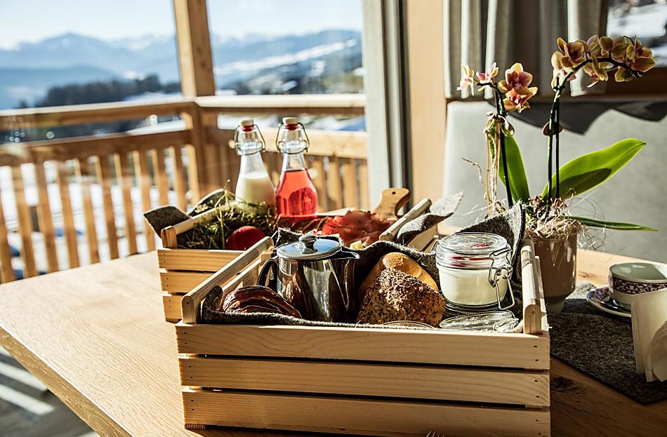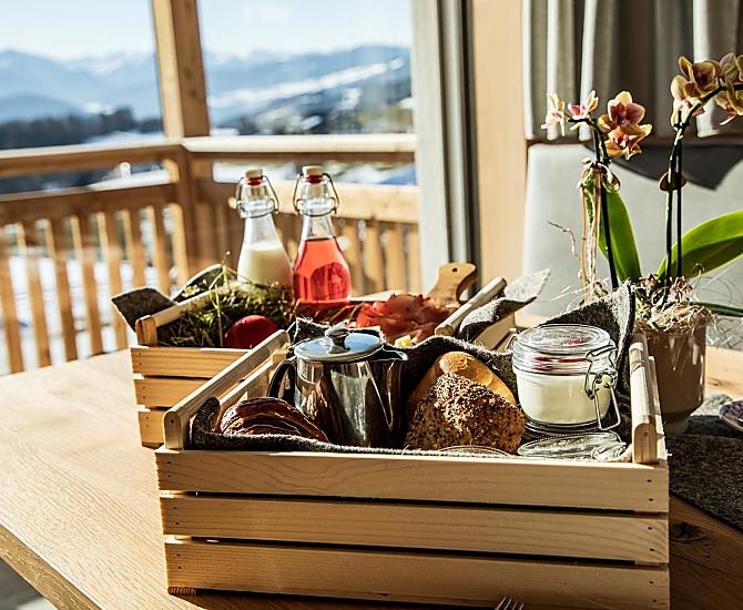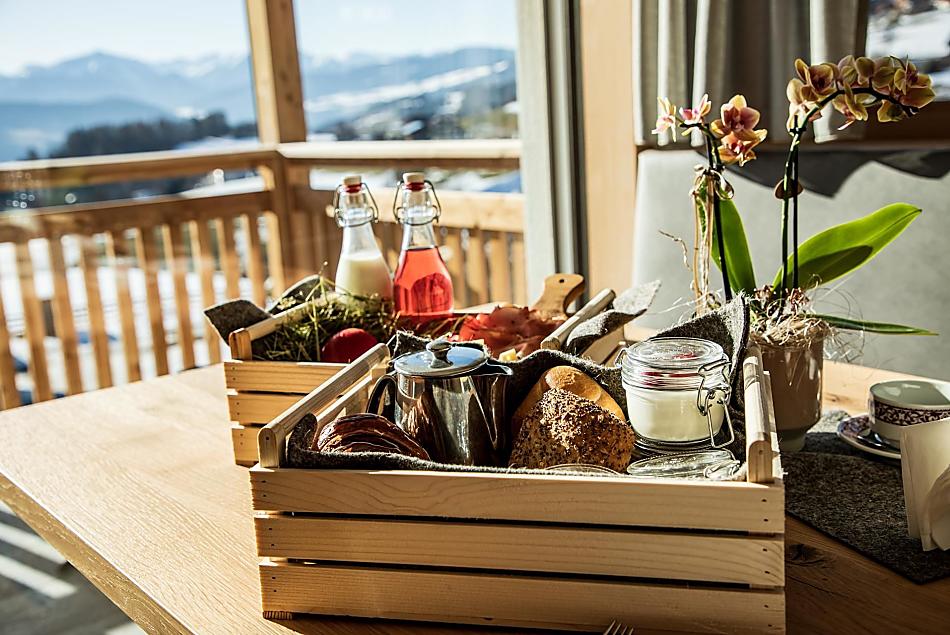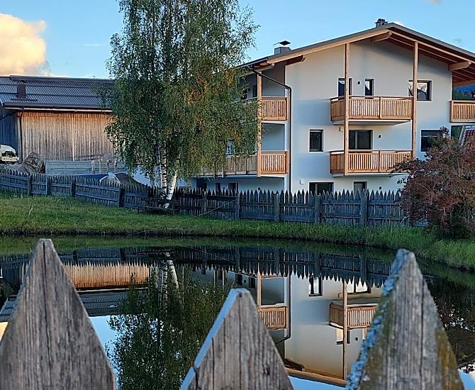 Our family-run accommodation is in a beautiful location on the Pustertal Sonnenstrasse, where you can go on great hikes from the house! There's plenty of space for guests of all ages to let off steam on our farm and our animals are looking forward to your attentions. You can relax in the panoramic sauna with its chill-out area and in summer on the lawn at the natural pond. To get your day off to a good start, we offer a breakfast basket filled with delicious products from the farm and the region.