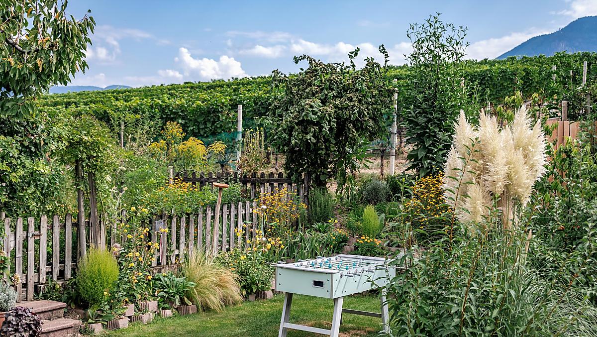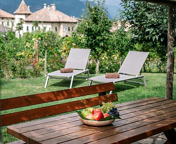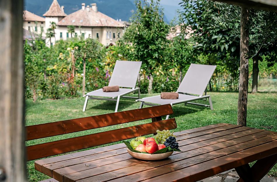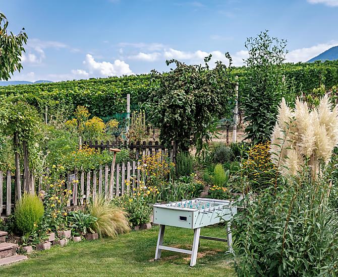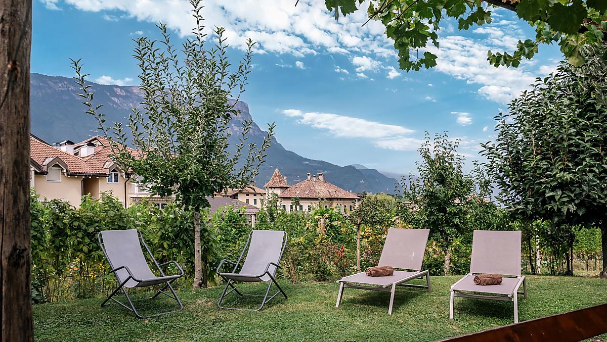 The farm is now being run by the fourth generation of our family and is located in the midst of the vineyards and apple trees we cultivate on the quiet outskirts of Girlan. Our well-kept sunbathing lawn with a gazebo with a view of the orchards and surrounding mountains invites you to linger and relax.