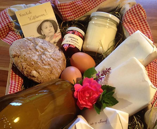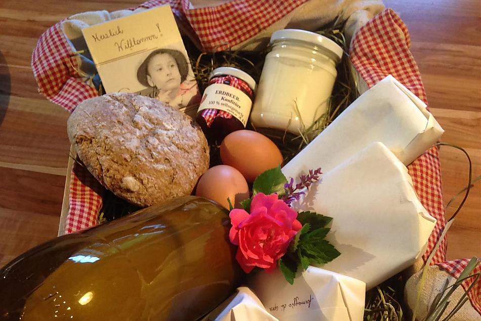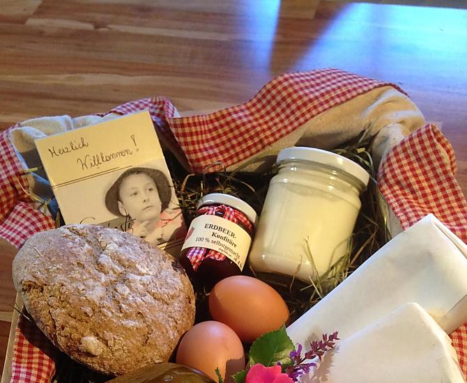 - Farm's own products at breakfast: milk, yoghurt, cheese, butter, speck, sausages, eggs, honey, fruit jams, cordial, fruit juice, dried fruit, herb teas, seasoning, bread, baked goods, fresh fruit in season