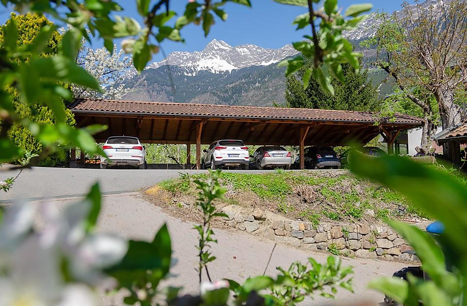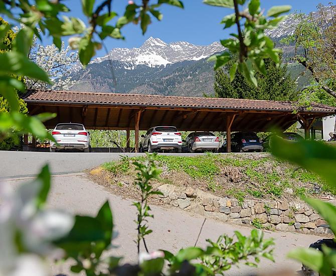If you come over the Reschen Pass, drive along the Vinschger state road to Forst Castle in Algund. Turn right here towards Marling and after 300 m you will find our entrance in the first left turn.