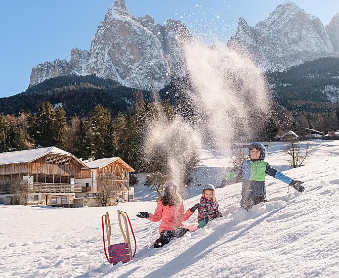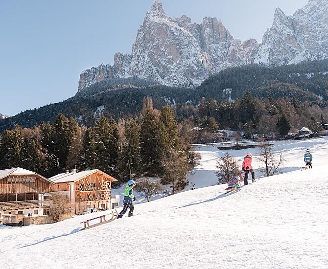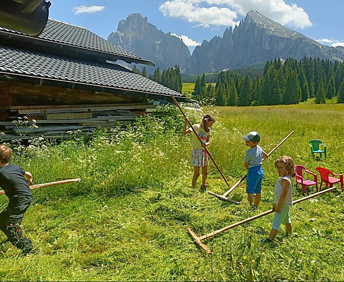 Our farm is located at an altitude of 934 m in the immediate vicinity of the Seis-Seiseralm gondola and the village of Seis am Schlern. If you wish, you can easily reach them on foot and combine this with an exciting hike through our picturesque mountains. Our little guests are particularly welcome. Our calves, goats, chickens and cats are already waiting to be petted. There is also more than enough space to romp at the Pitzelterhof. There are also numerous hiking trails nearby, which lead you to numerous sights and leisure activities in every season. Because our beautiful region is always worth a trip and offers ideal conditions for a hiking holiday in the Dolomites. You are welcome to leave your car in the covered parking lot during all your activities. There is a bus stop right in front of the house, which will take you to all the important destinations in the area.