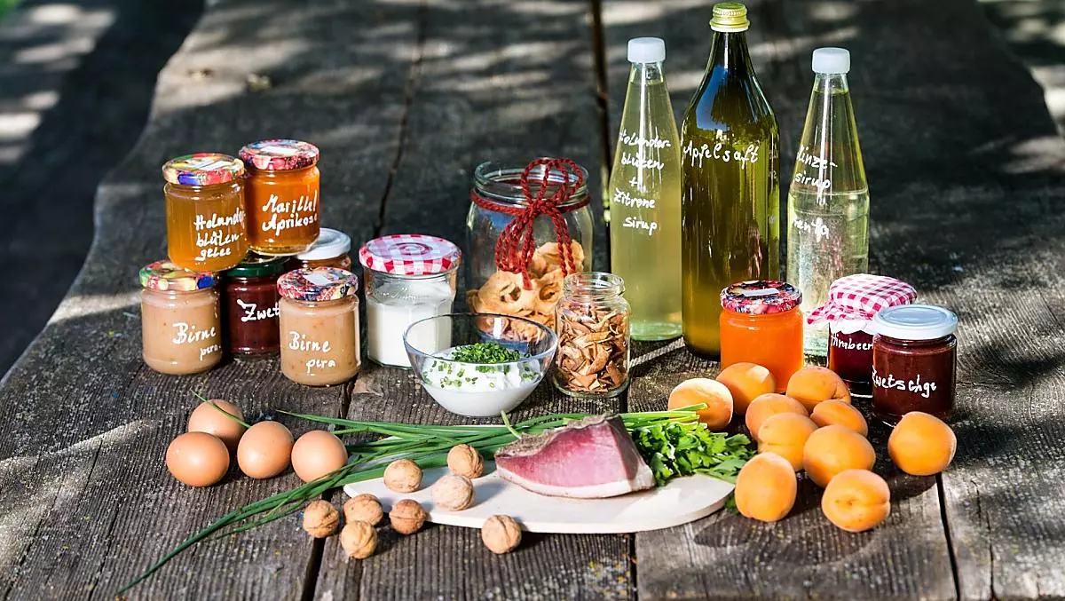 speck, eggs, fruit jams, cordial, fruit juice ...