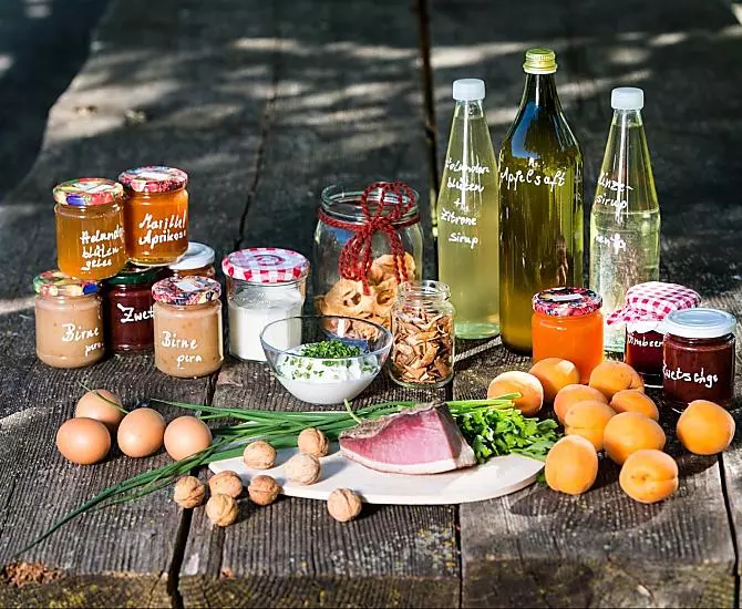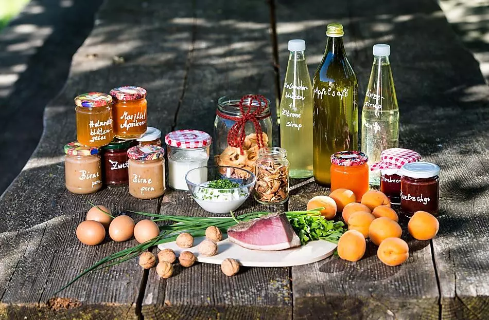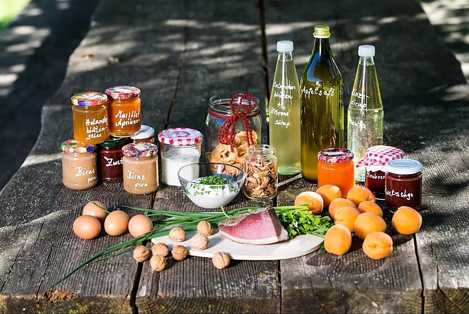 - Farm's own products at breakfast: speck, eggs, fruit jams, cordial, fruit juice, dried fruit, jellies, pickles, herb teas, seasoning, grain , fresh vegetables in season, fresh fruit in season