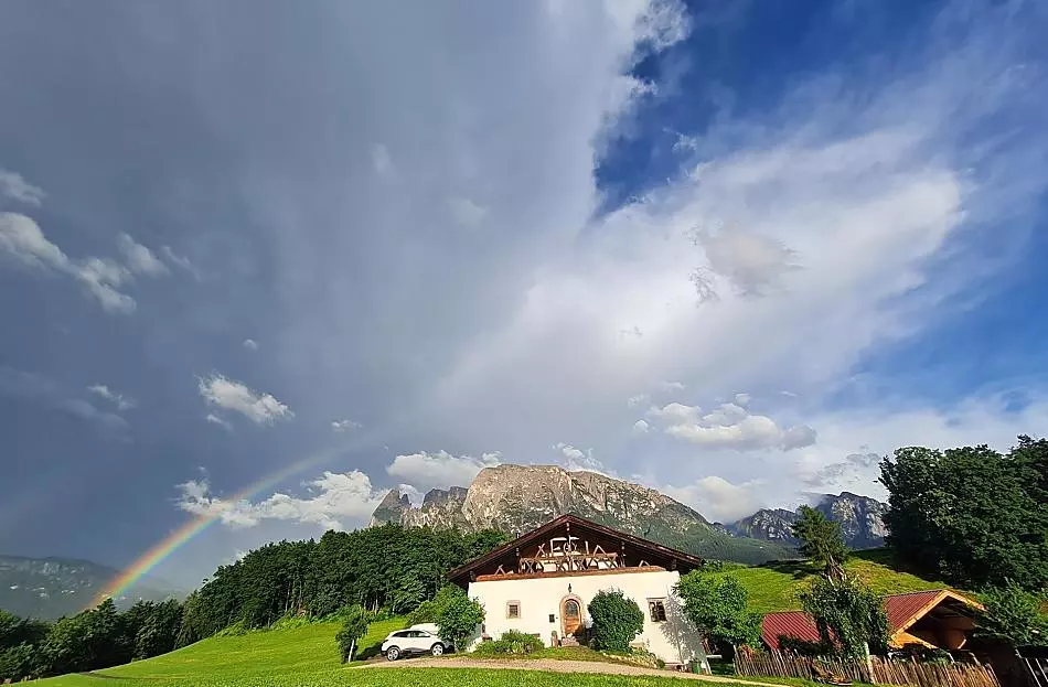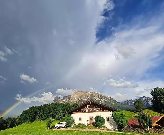 The Salmsein organic farm is located at 1,000 meters in Völs am Schlern, in the heart of the skiing and hiking paradise of the Seiseralm. It is very sunny, away from the noise of the streets. In addition, our farm has a natural bathing pond with bathing jetty, which invites you to bathe, linger or recharge your batteries.