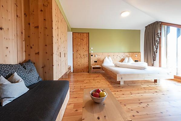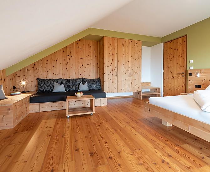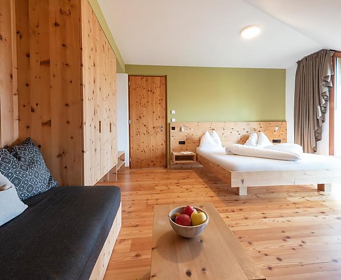 Above Kaltern the small village of Oberplanitzing, great wine tradition, enviable all-round view, sun-kissed slopes, living farming tradition. And right in the middle: the surprisingly different organic farm St. Quirinus with saltwater swimming pool and sauna!
