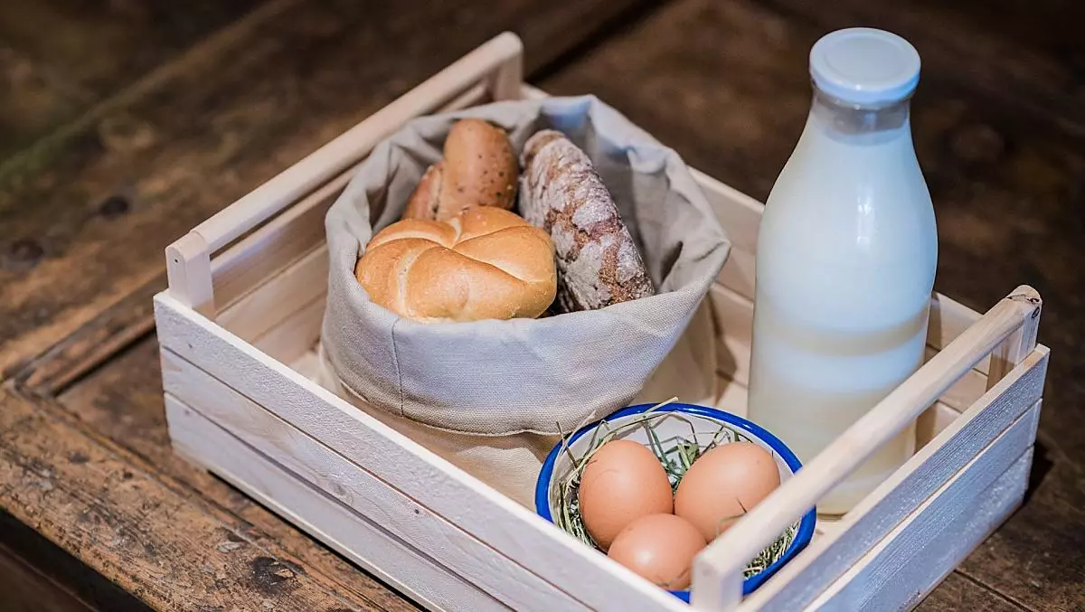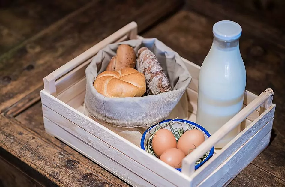 milk, eggs, honey, fruit jams