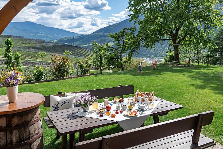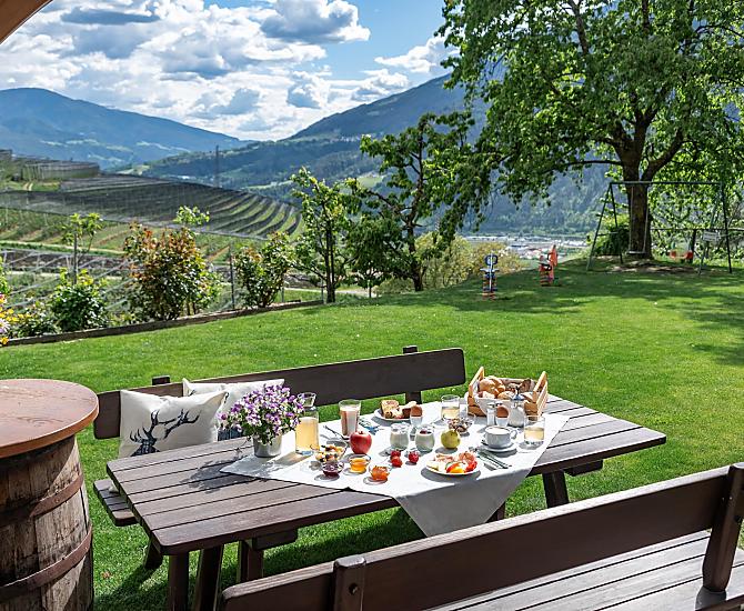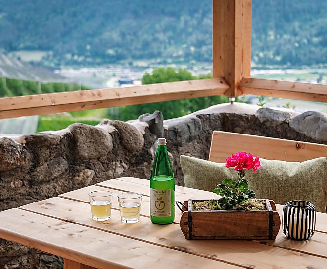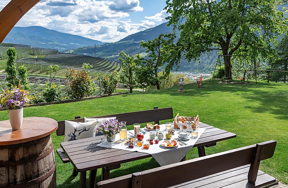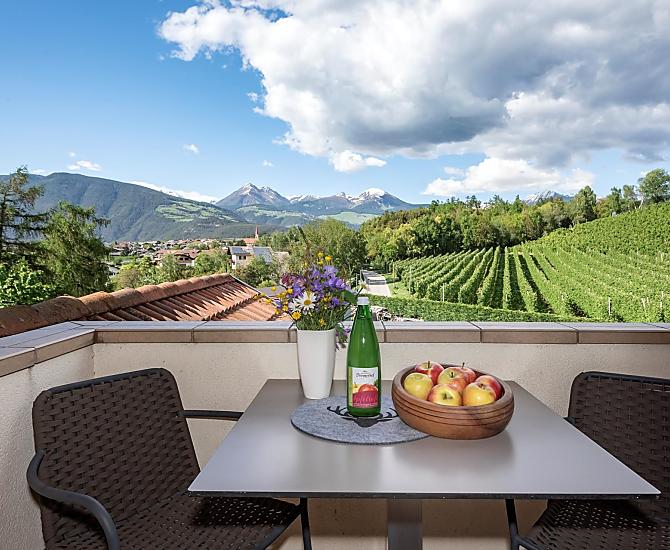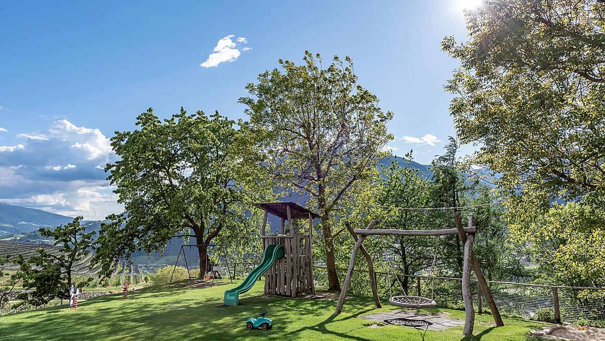 Our family-run fruit and wine-growing business is in a beautiful location at the end of the village of Raas. In the midst of vineyards and apple orchards you will find relaxation and tranquility with a wonderful view of the Brixen valley basin. On our large sun terrace you can relax and enjoy the view and the peace while the children let off steam in the beautiful children's playground.