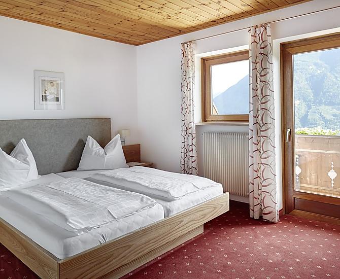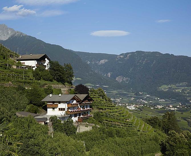 OIur farm is situated above the spa town of Meran, surrounded by greenery, orchards and vineyards with a marvellous view over the Etsch valley and the Vinschgau. Our farm is surrounded by numerous sights and is an ideal holiday destination for those seeking peace and quiet and for hikers.